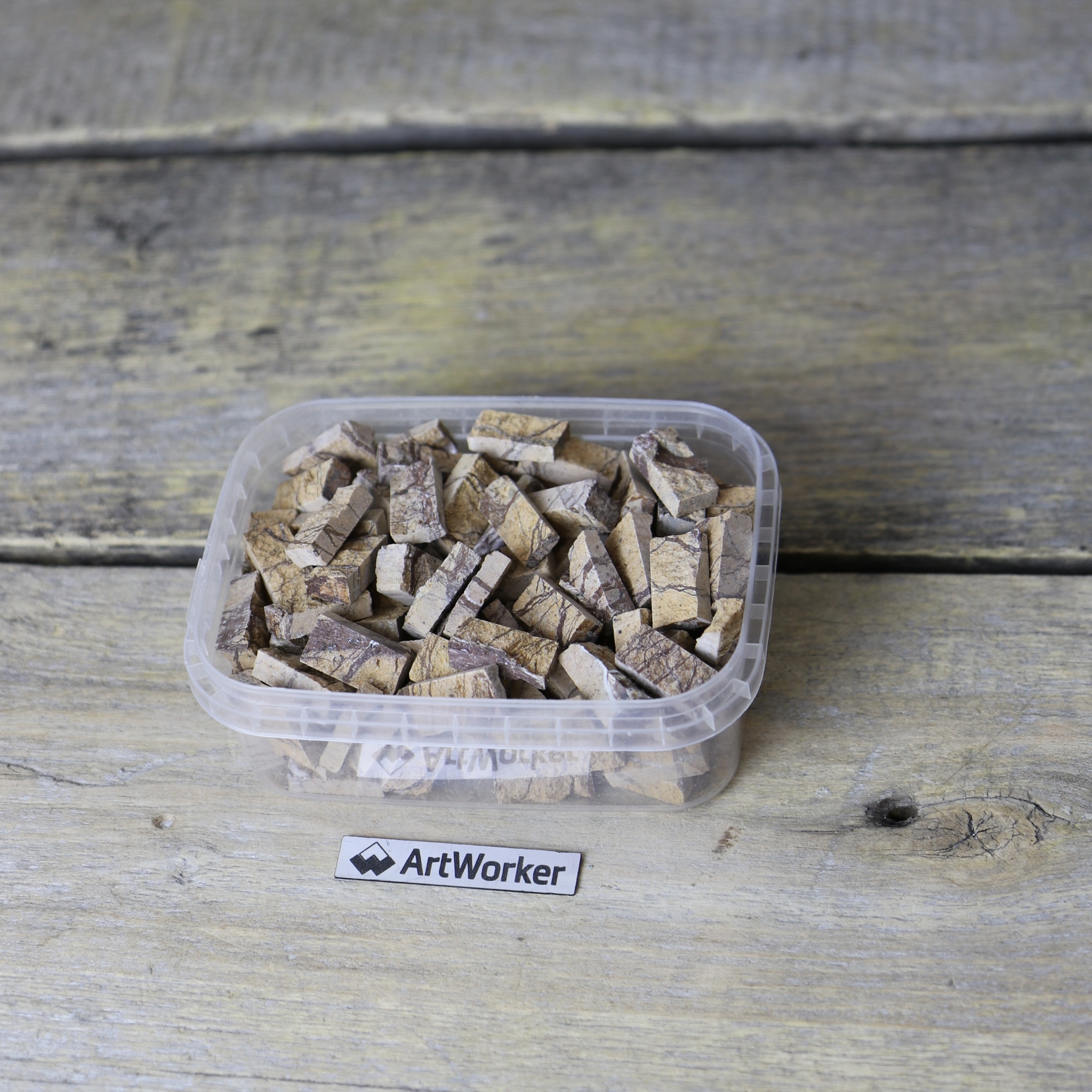 Поставляется в прозрачном контейнере, вес материала и контейнера 350 гр (+/- 20 гр). Для колки натурального камня потребуются кусачки-щипцы (кусачки для мозаики), к примеру RedCut 83 или RedCut 82. Колотый камень можно приклеивать на цементный клей (например Kerabond + Isolastic) или любой другой подходящий клей.