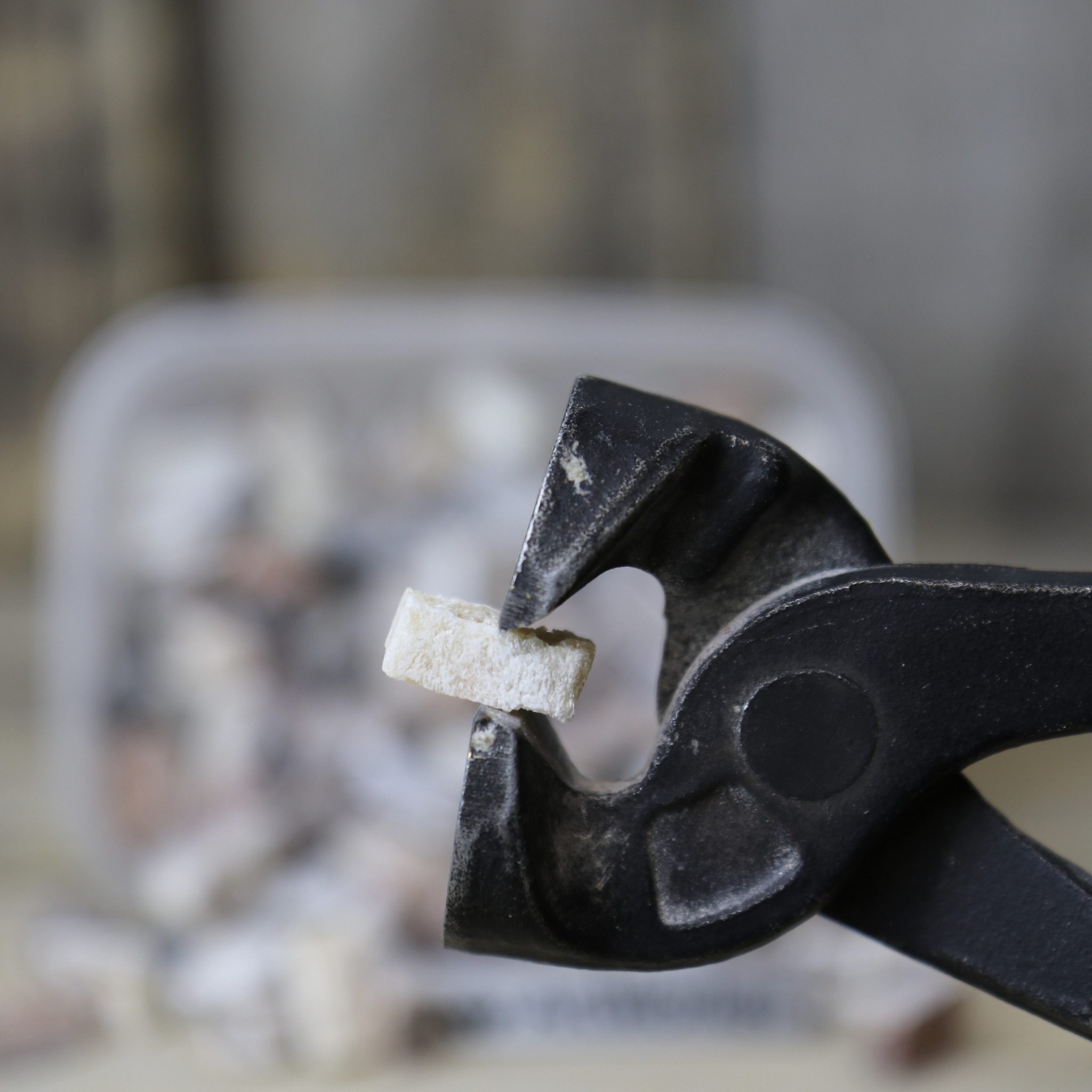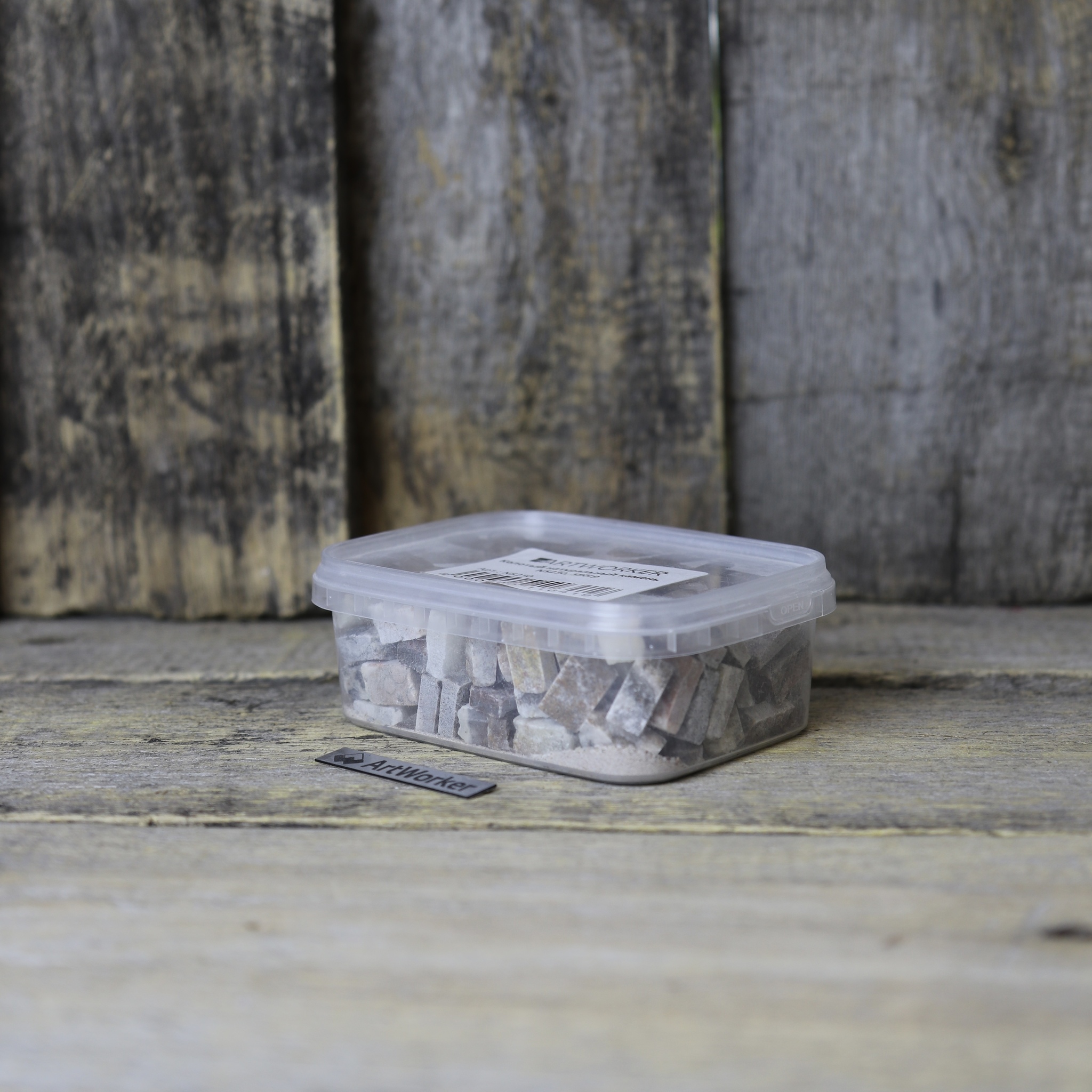 Поставляется в прозрачном контейнере, вес материала и контейнера 350 гр (+/- 20 гр). Для колки натурального камня потребуются кусачки-щипцы (кусачки для мозаики), к примеру RedCut 83 или RedCut 82. Колотый камень можно приклеивать на цементный клей (например Kerabond + Isolastic) или любой другой подходящий клей.