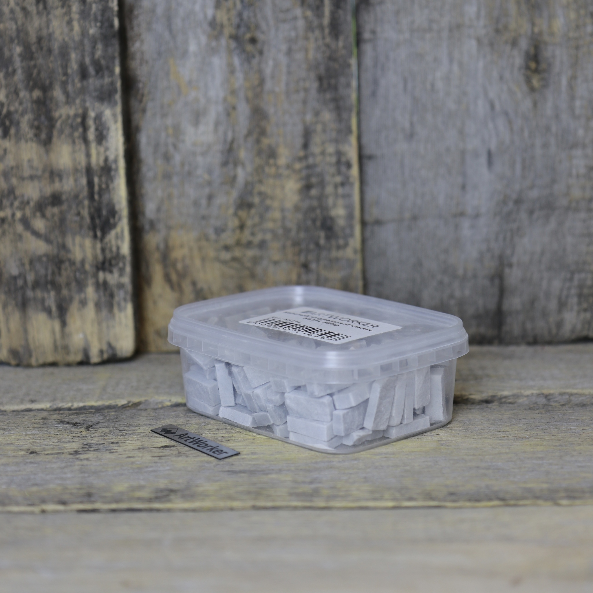 Поставляется в прозрачном контейнере, вес материала и контейнера 350 гр (+/- 20 гр). Для колки натурального камня потребуются кусачки-щипцы (кусачки для мозаики), к примеру RedCut 83 или RedCut 82. Колотый камень можно приклеивать на цементный клей (например Kerabond + Isolastic) или любой другой подходящий клей.