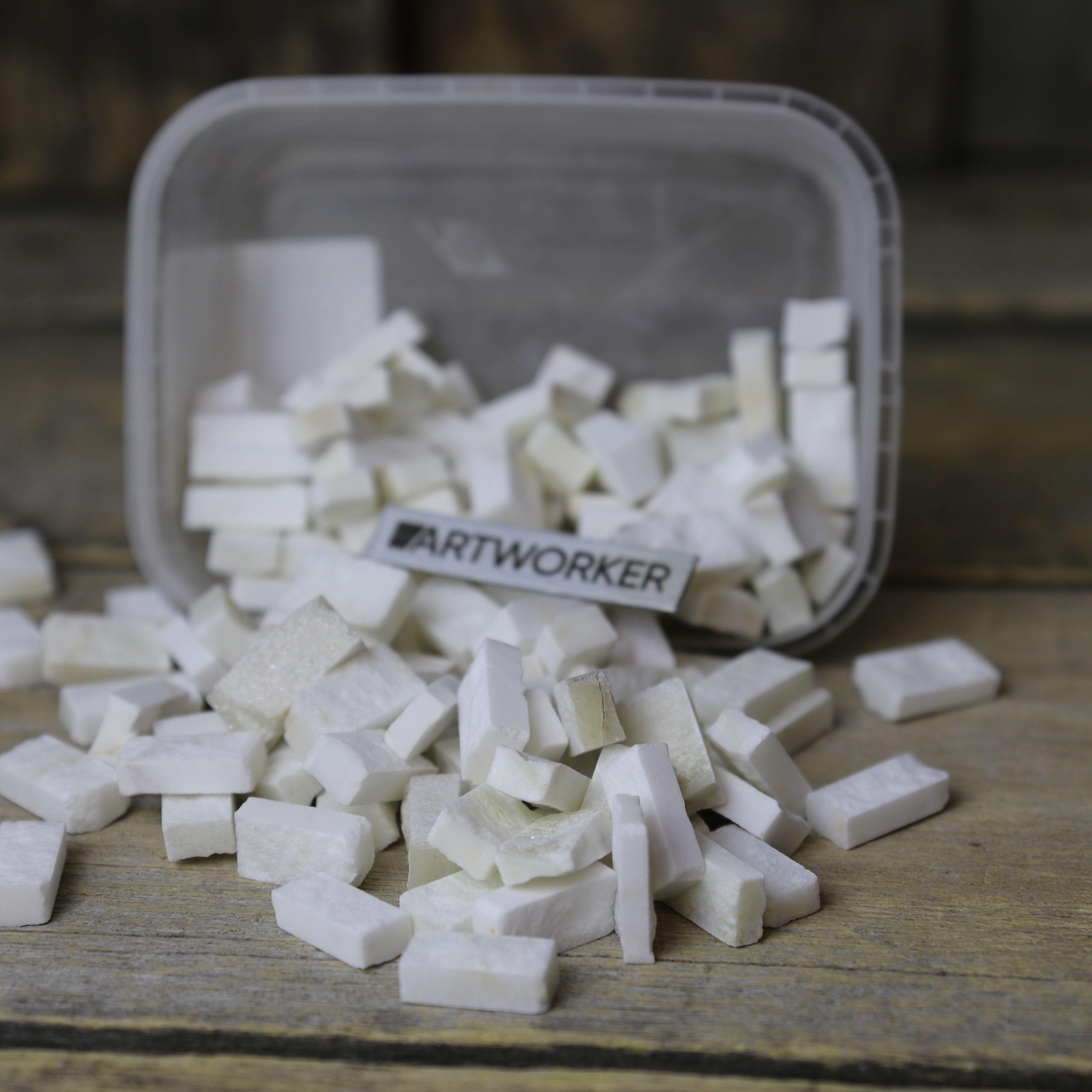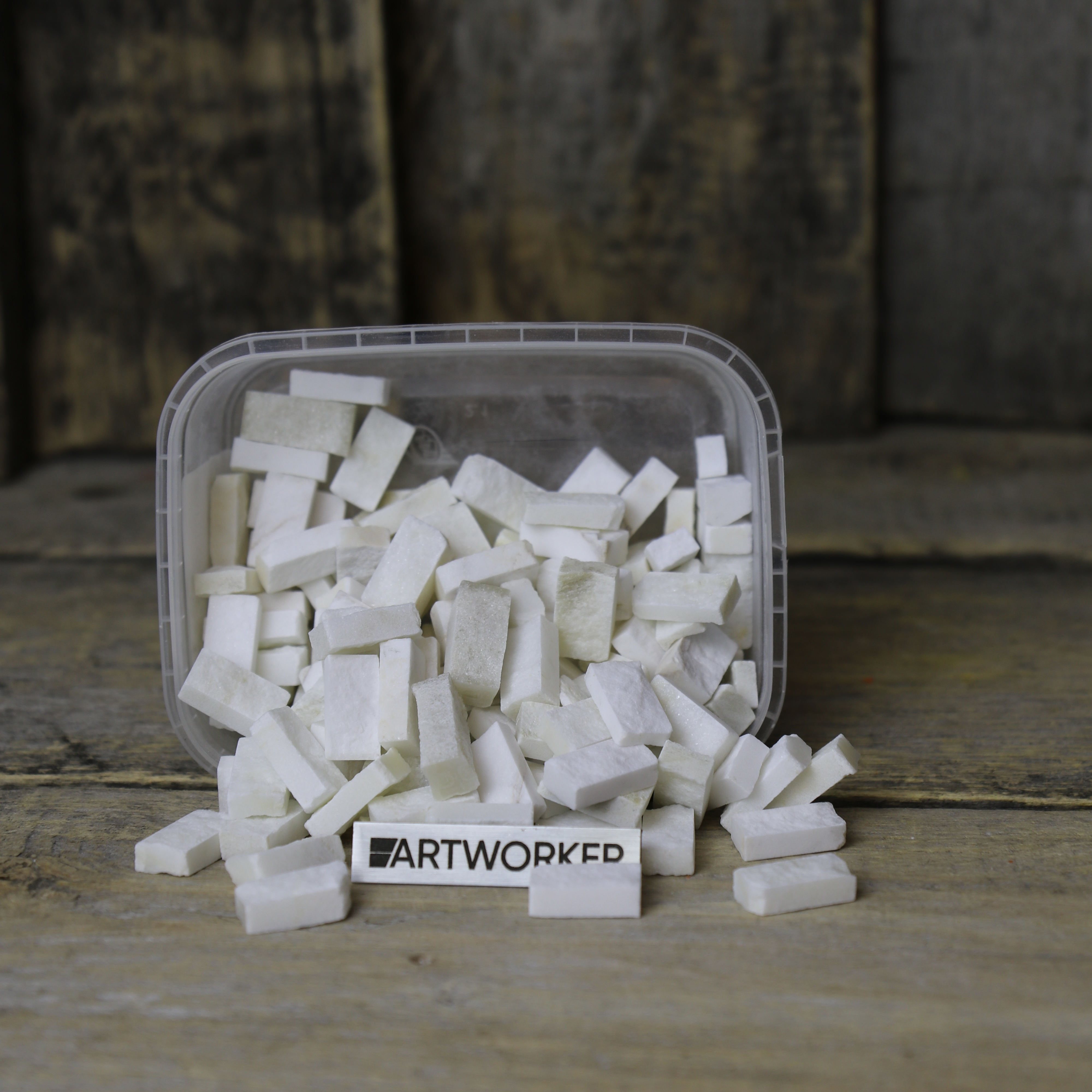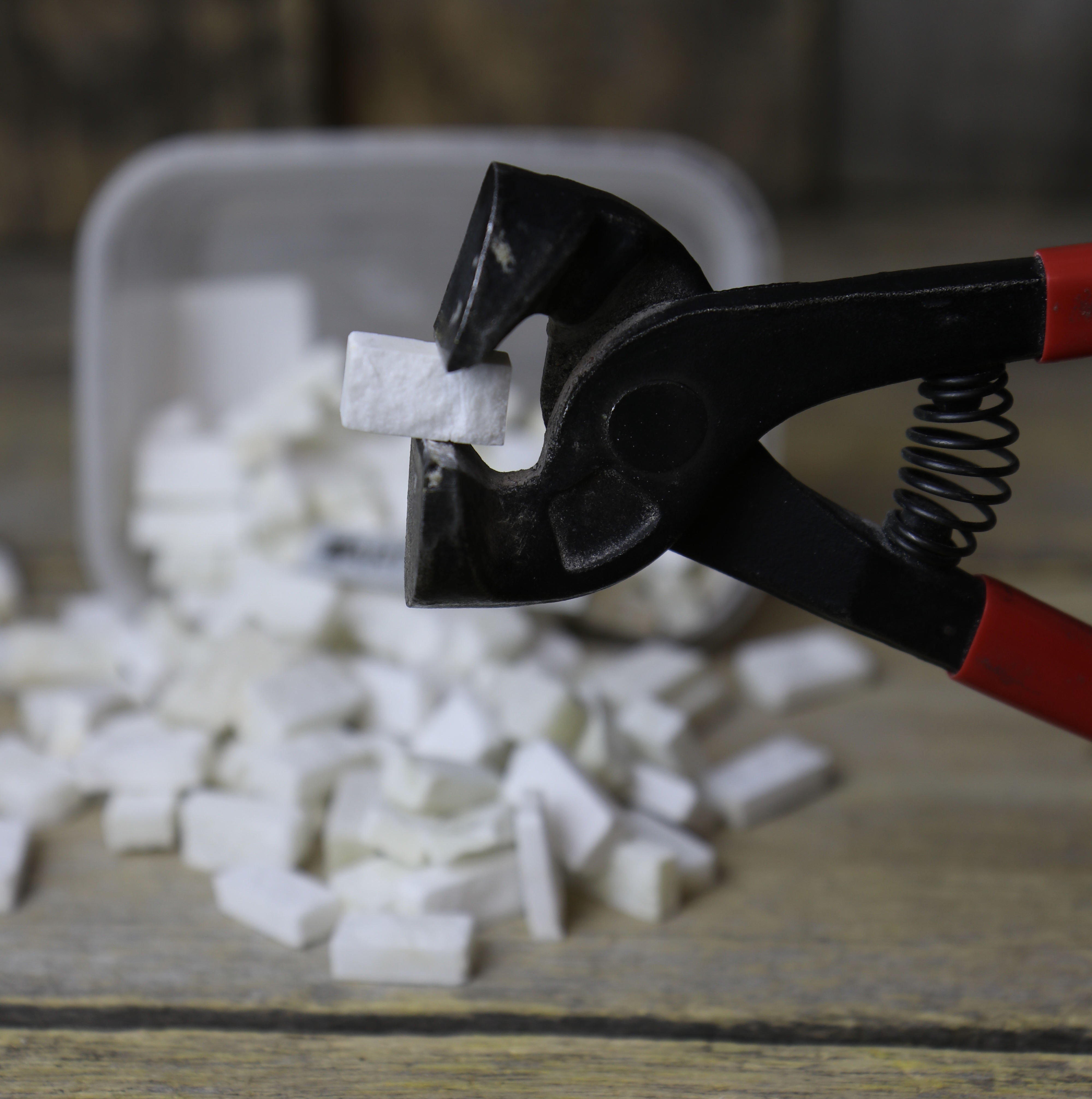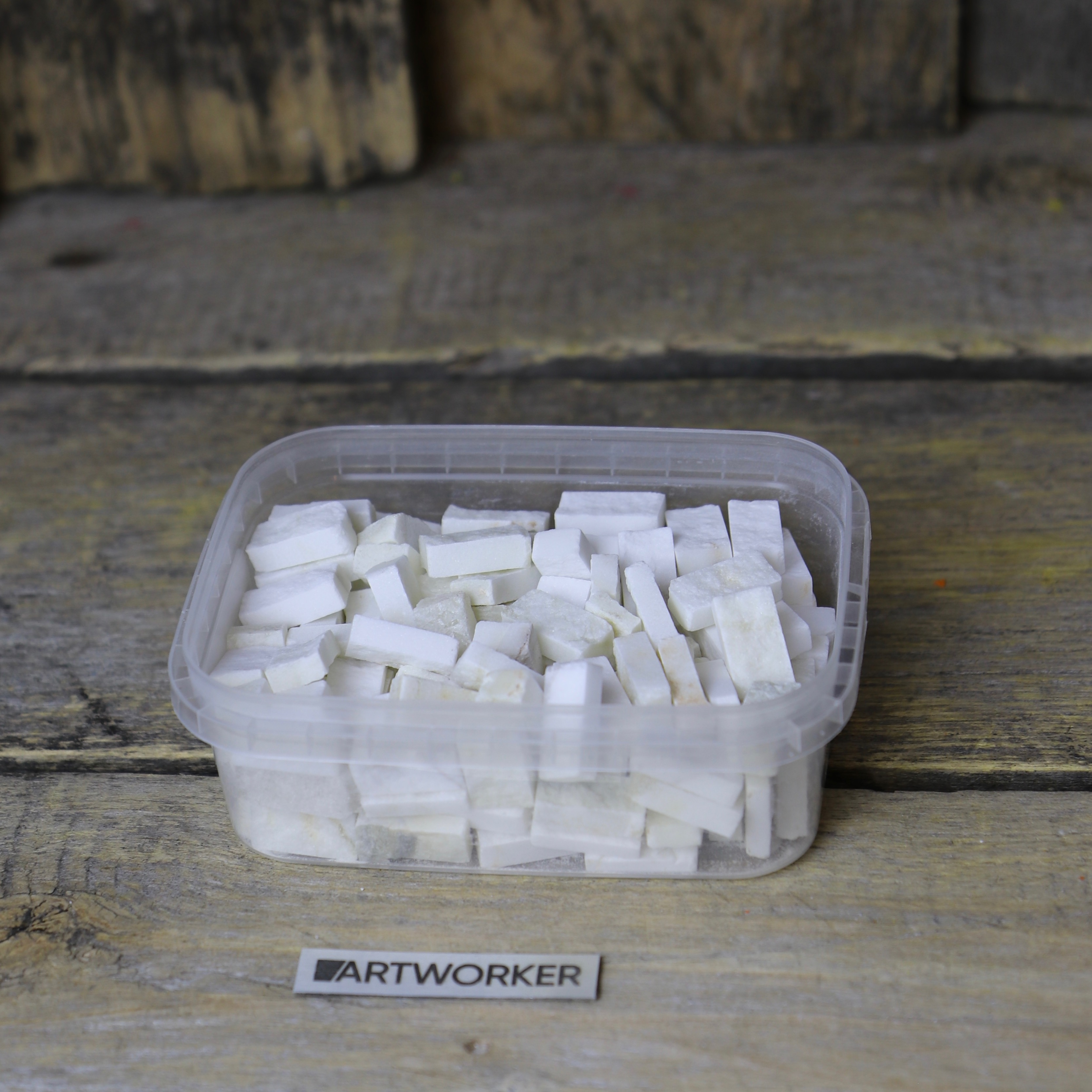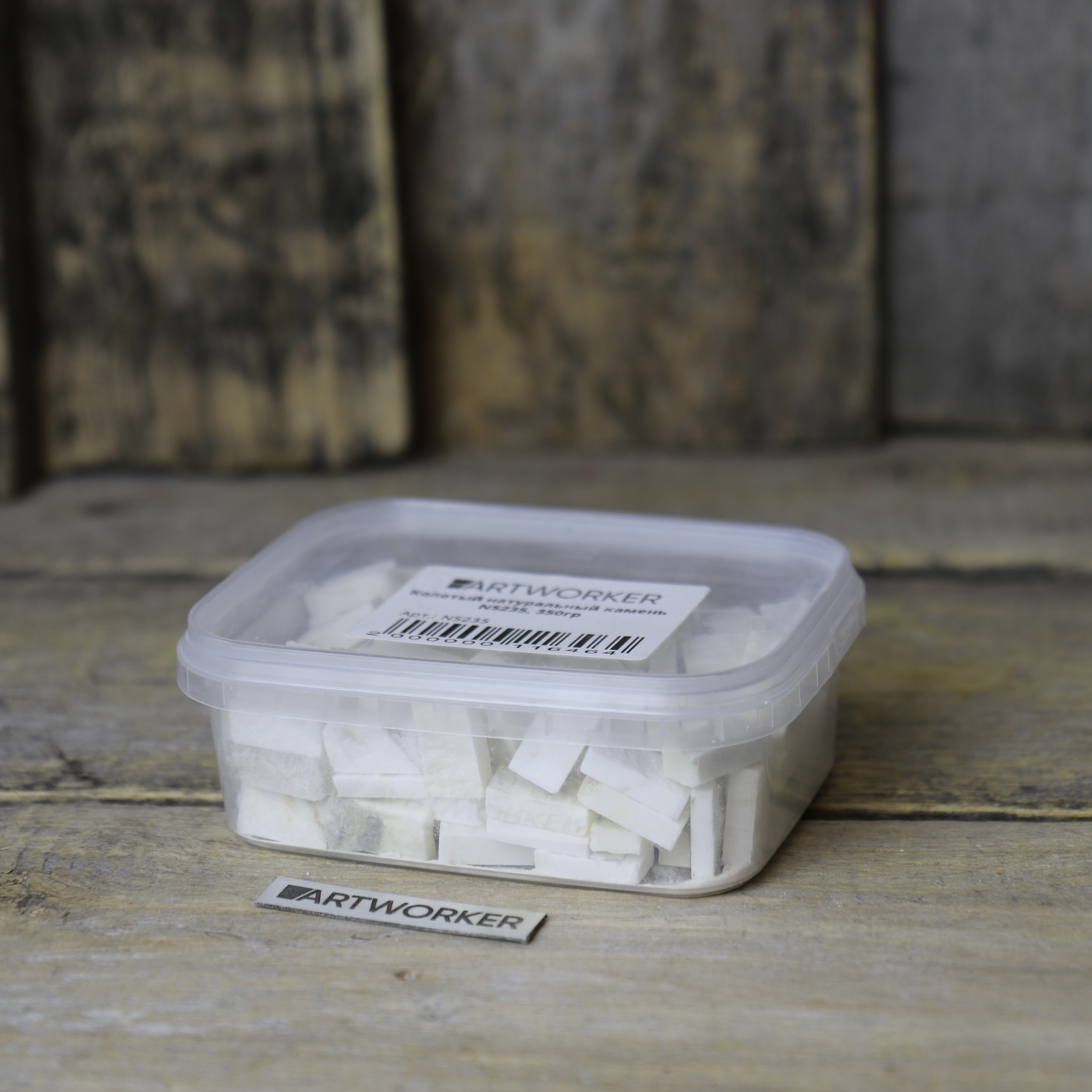 Поставляется в прозрачном контейнере, вес материала и контейнера 350 гр (+/- 20 гр). Для колки натурального камня потребуются кусачки-щипцы (кусачки для мозаики), к примеру RedCut 83 или RedCut 82. Колотый камень можно приклеивать на цементный клей (например Kerabond + Isolastic) или любой другой подходящий клей.