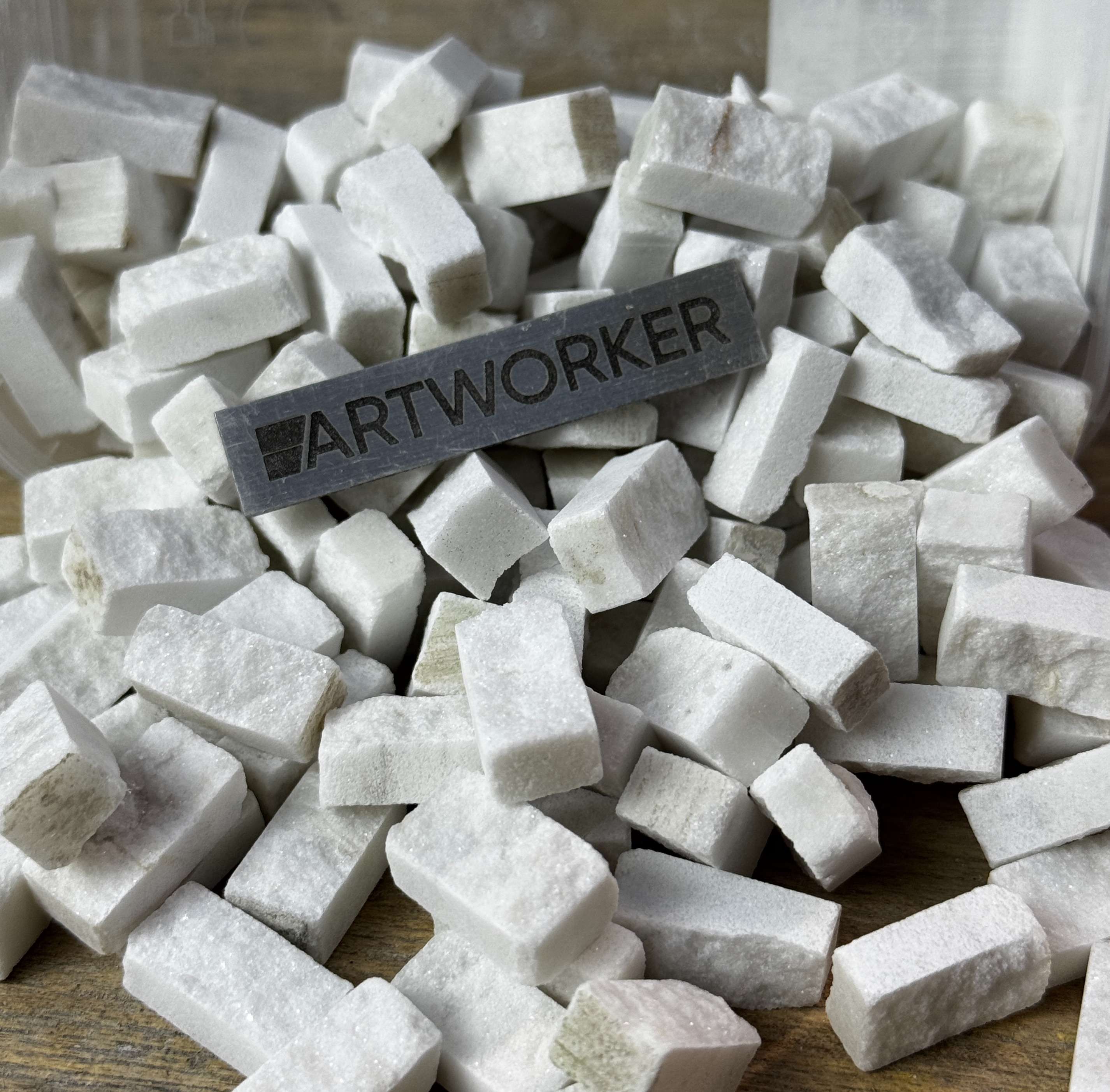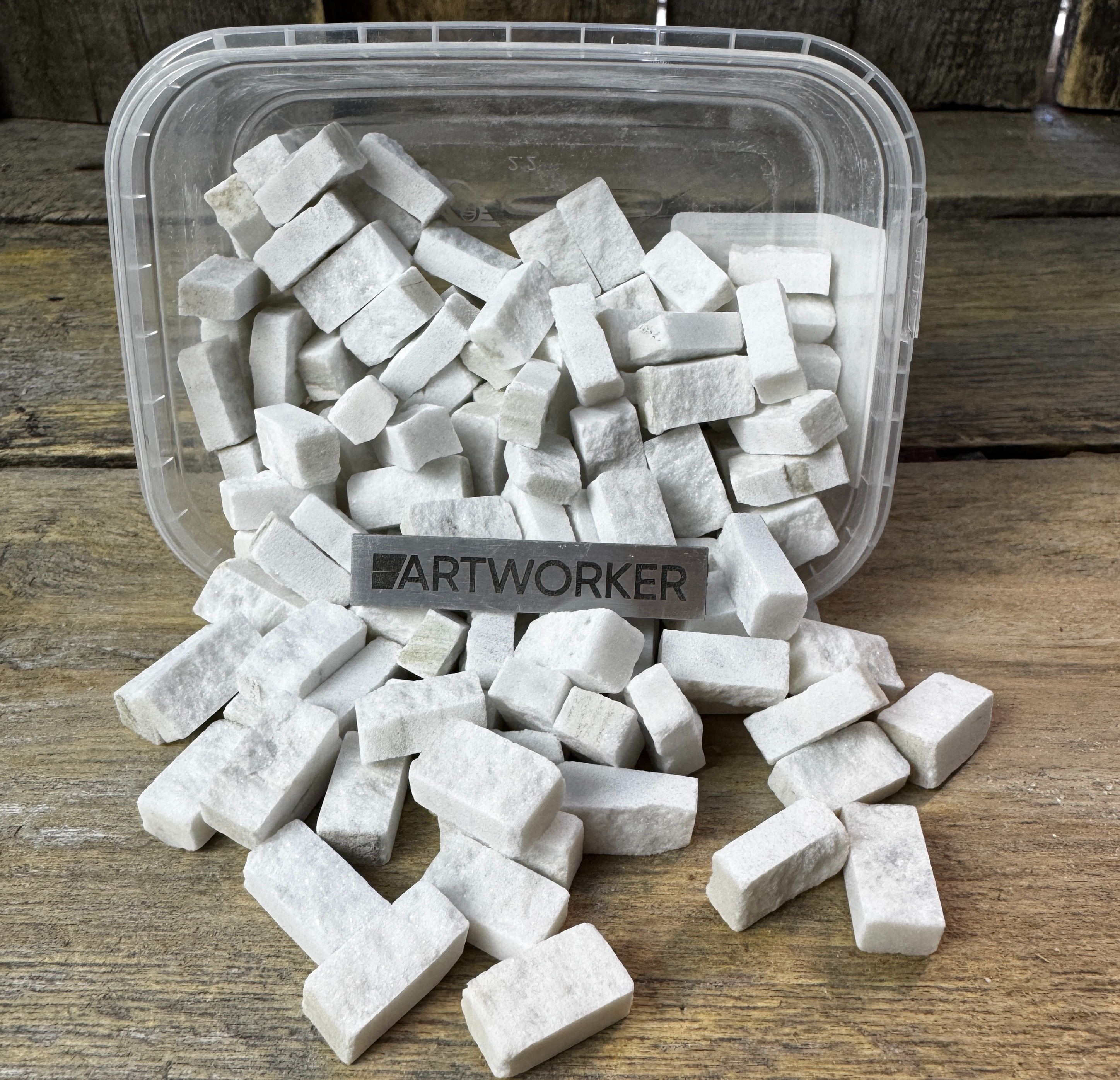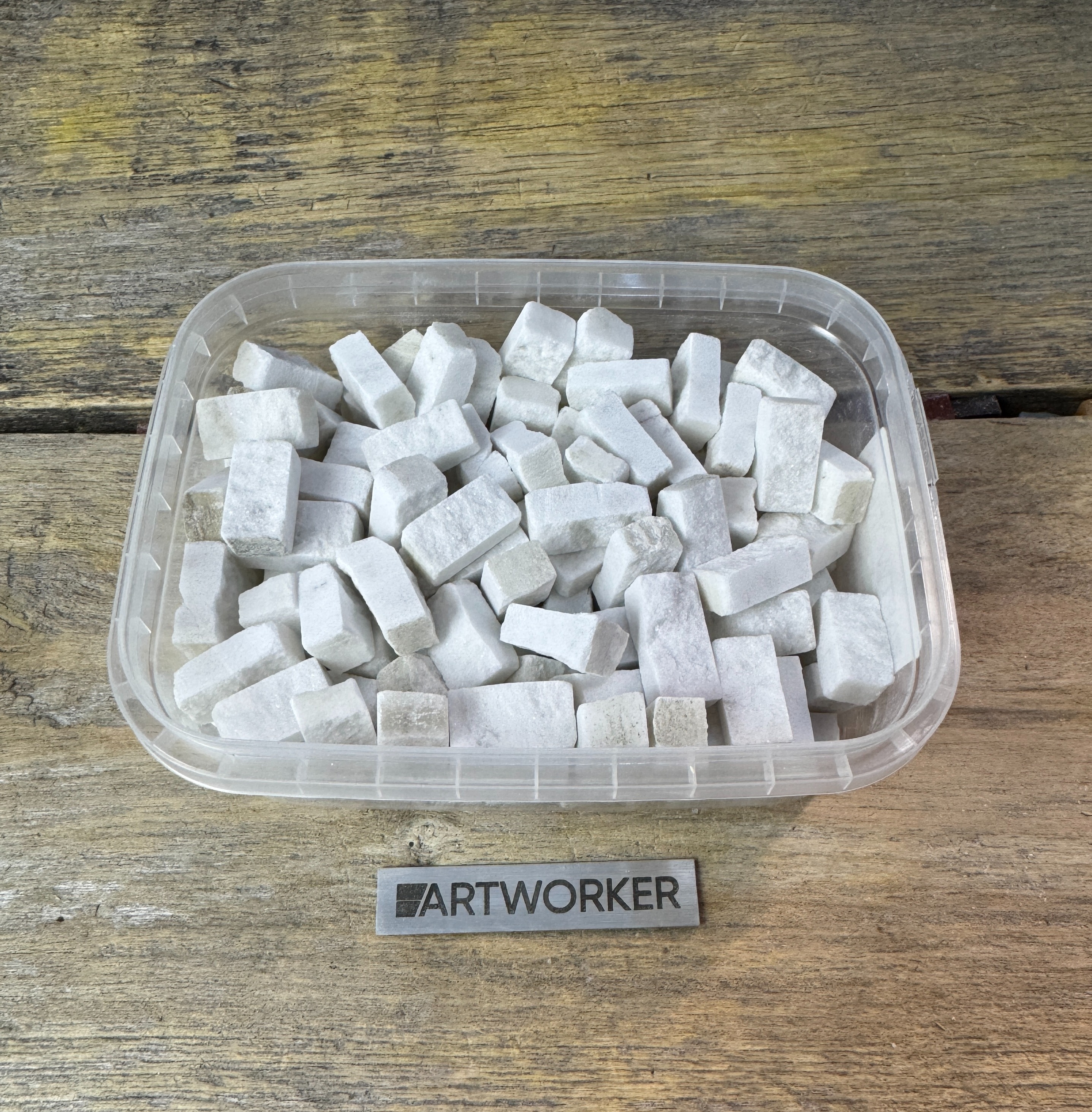 Поставляется в прозрачном контейнере, вес материала и контейнера 350 гр (+/- 20 гр). Для колки натурального камня потребуются кусачки-щипцы (кусачки для мозаики), к примеру RedCut 83 или RedCut 82. Колотый камень можно приклеивать на цементный клей (например Kerabond + Isolastic) или любой другой подходящий клей.