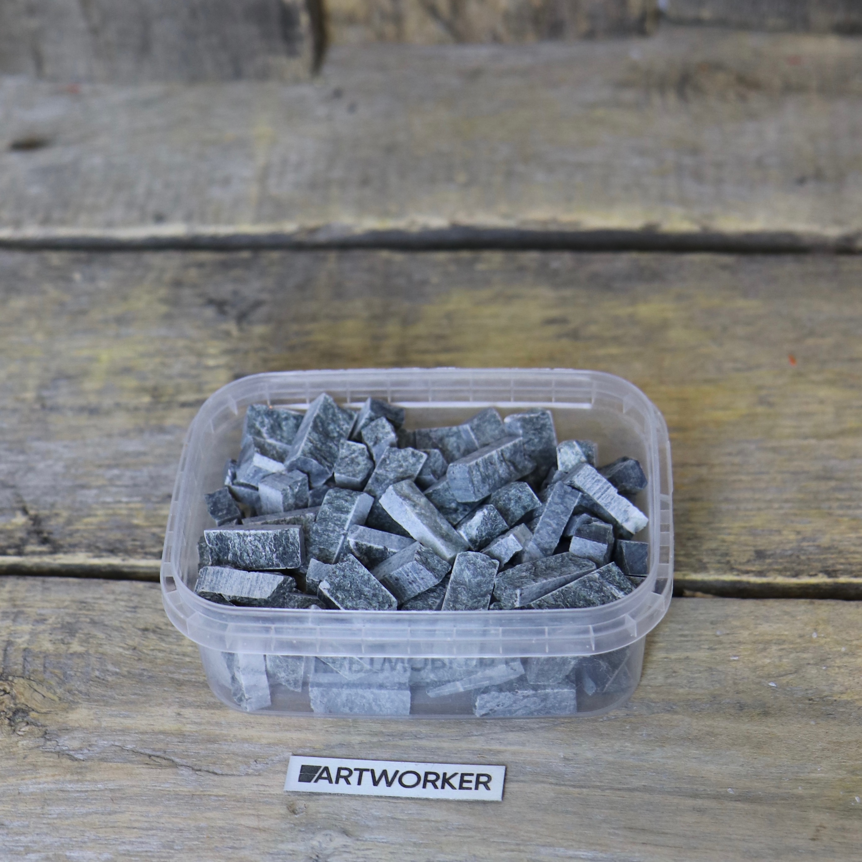 Поставляется в прозрачном контейнере, вес материала и контейнера 350 гр (+/- 20 гр). Для колки натурального камня потребуются кусачки-щипцы (кусачки для мозаики), к примеру RedCut 83 или RedCut 82. Колотый камень можно приклеивать на цементный клей (например Kerabond + Isolastic) или любой другой подходящий клей.