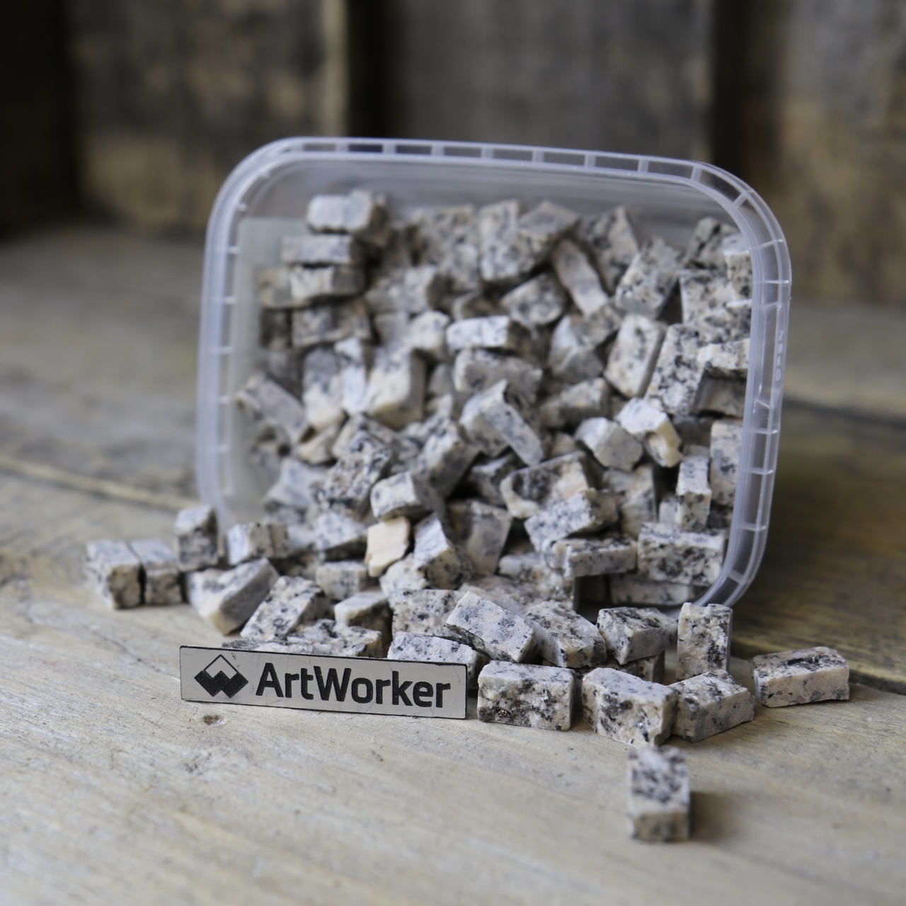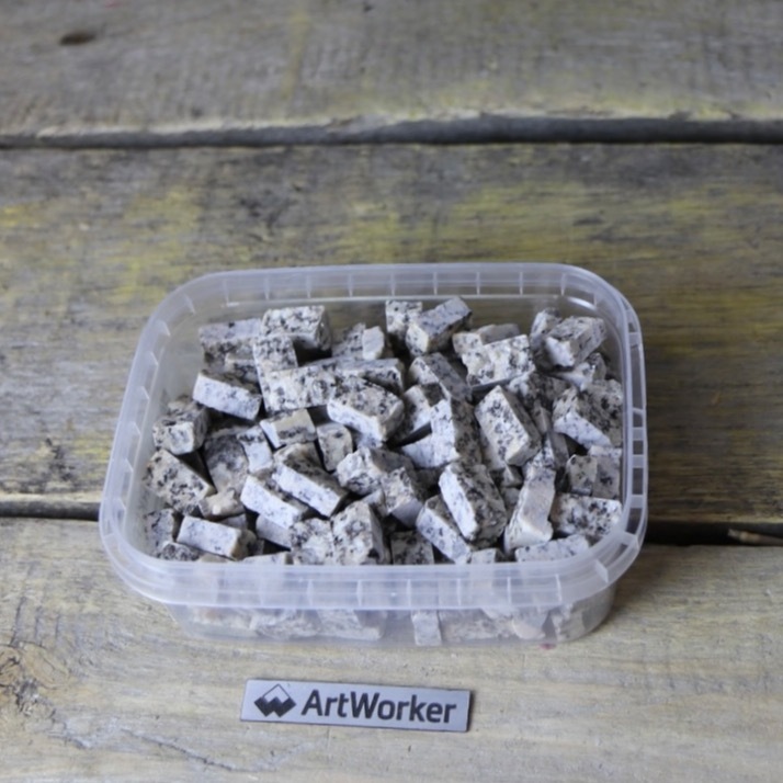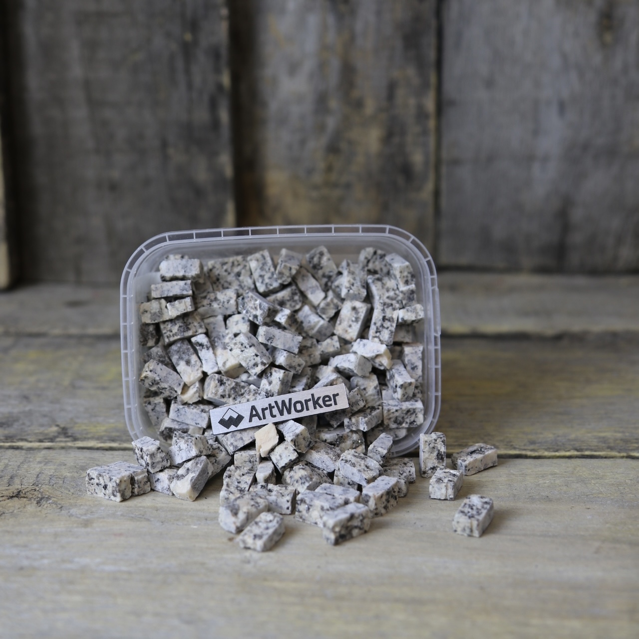 Поставляется в прозрачном контейнере, вес материала и контейнера 350 гр. Для колки натурального камня потребуются кусачки-щипцы (кусачки для мозаики), к примеру RedCut 83 или RedCut 82. Колотый камень можно приклеивать на цементный клей (например Kerabond + Isolastic) или любой другой подходящий клей.