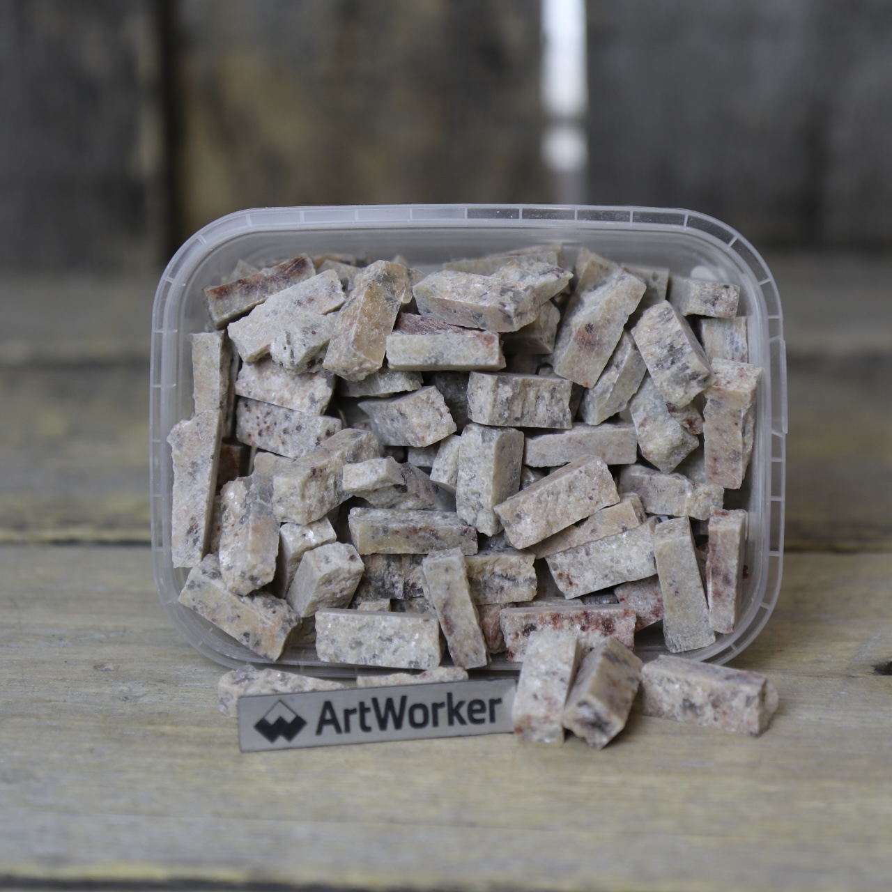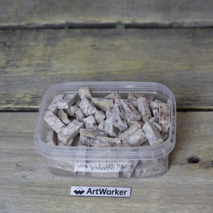 Поставляется в прозрачном контейнере, вес материала и контейнера 350 гр (+/- 20 гр). Для колки натурального камня потребуются кусачки-щипцы (кусачки для мозаики), к примеру RedCut 83 или RedCut 82. Колотый камень можно приклеивать на цементный клей (например Kerabond + Isolastic) или любой другой подходящий клей.