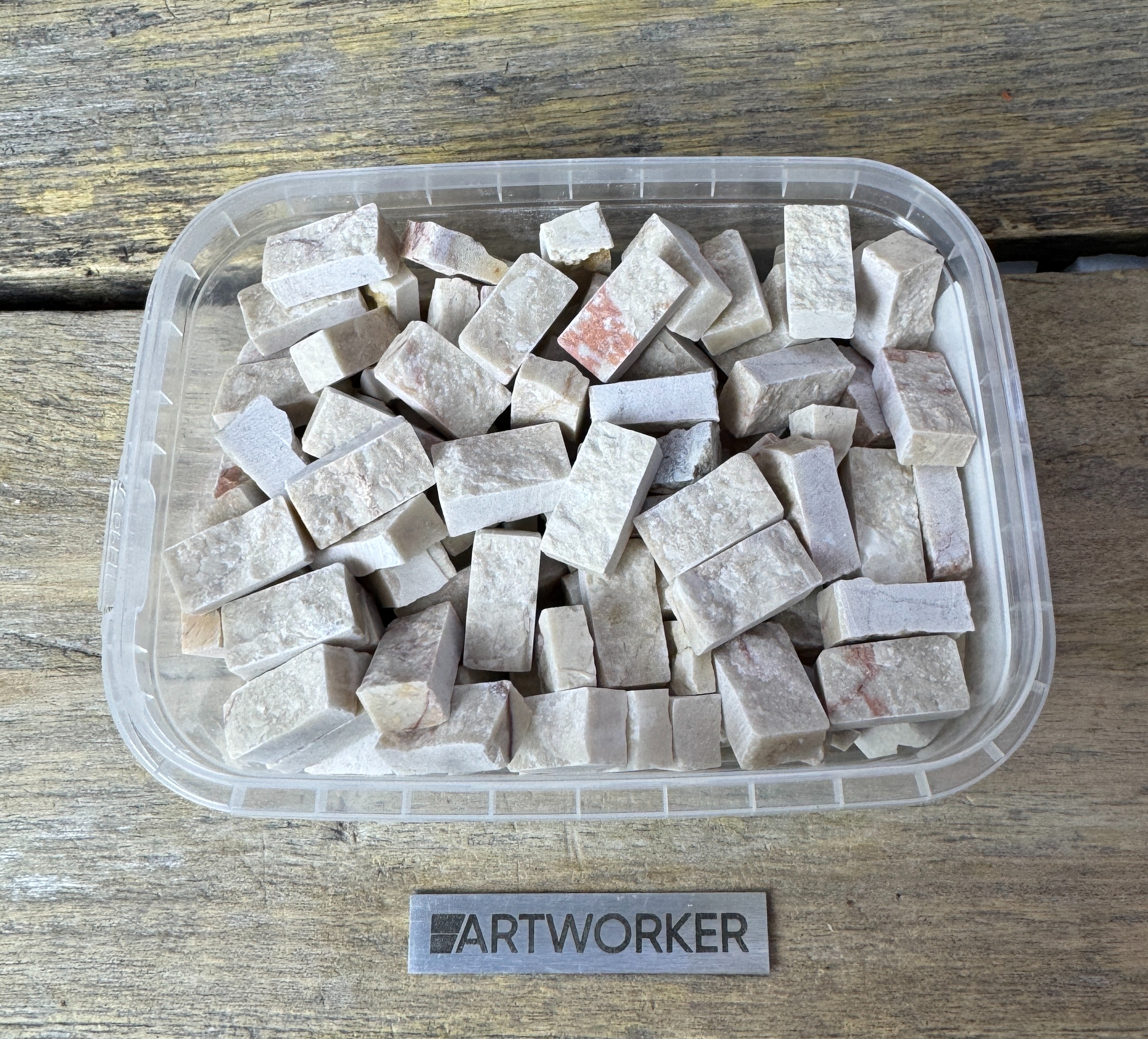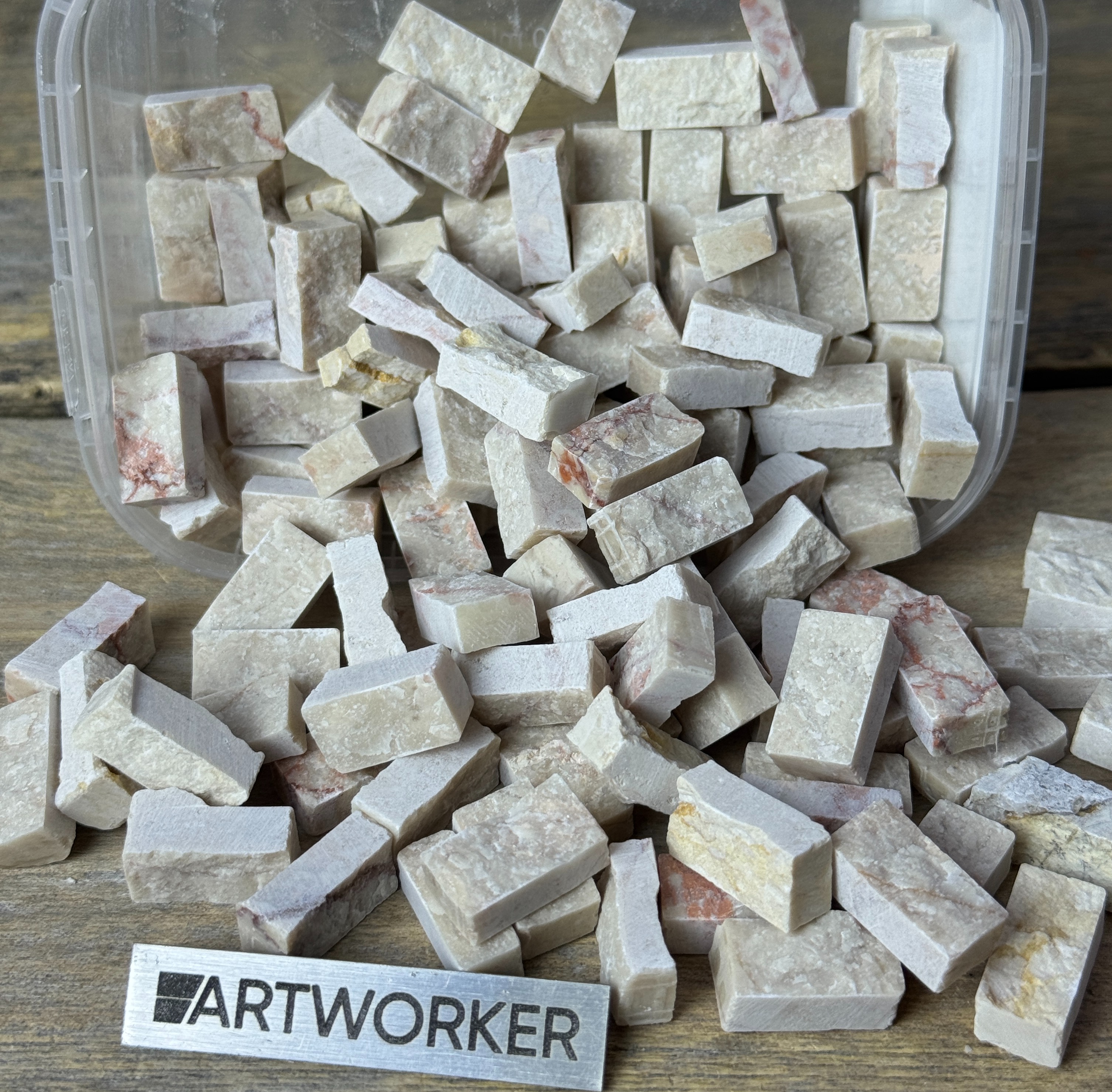 Поставляется в прозрачном контейнере, вес материала и контейнера 350 гр (+/- 20 гр). Для колки натурального камня потребуются кусачки-щипцы (кусачки для мозаики), к примеру RedCut 83 или RedCut 82. Колотый камень можно приклеивать на цементный клей (например Kerabond + Isolastic) или любой другой подходящий клей.