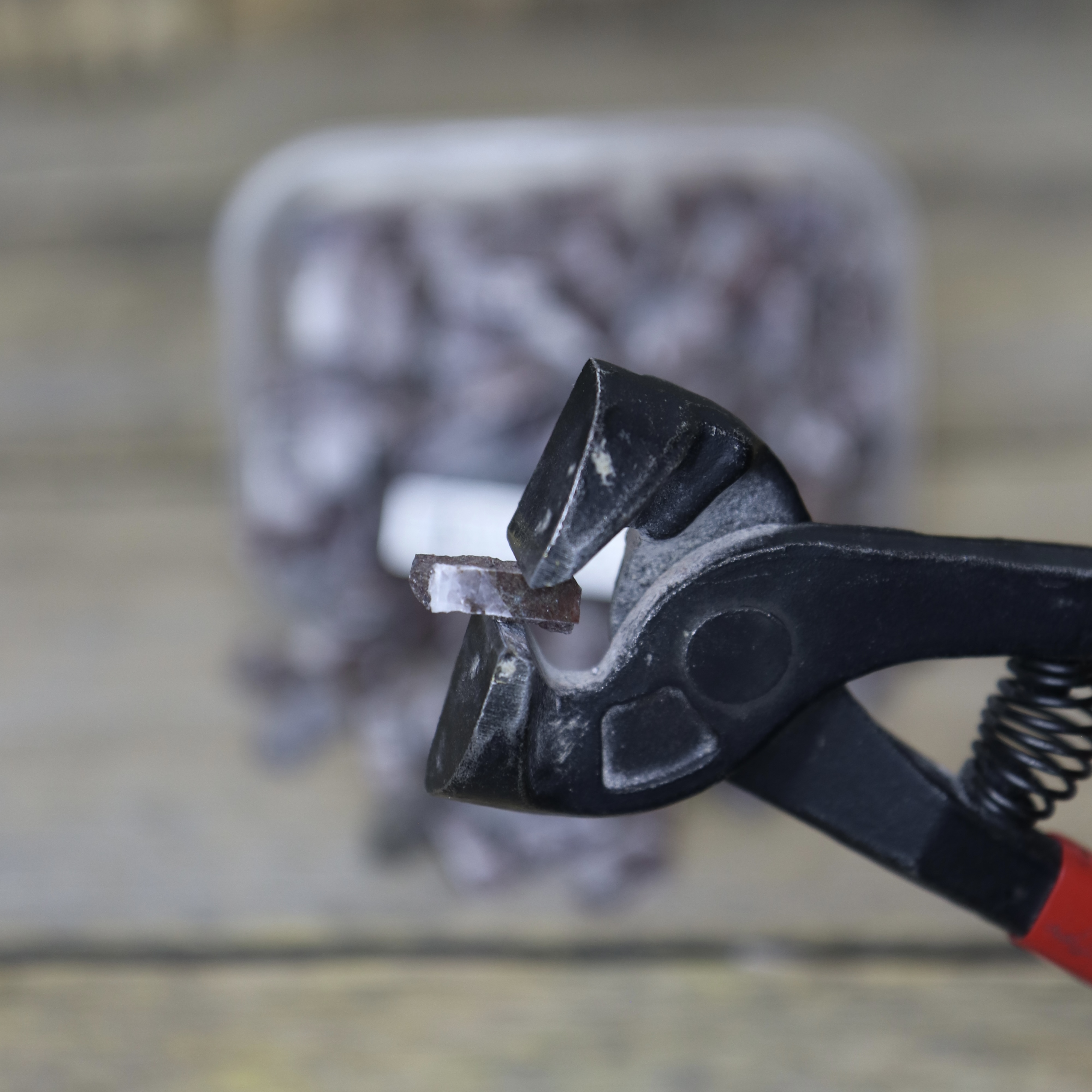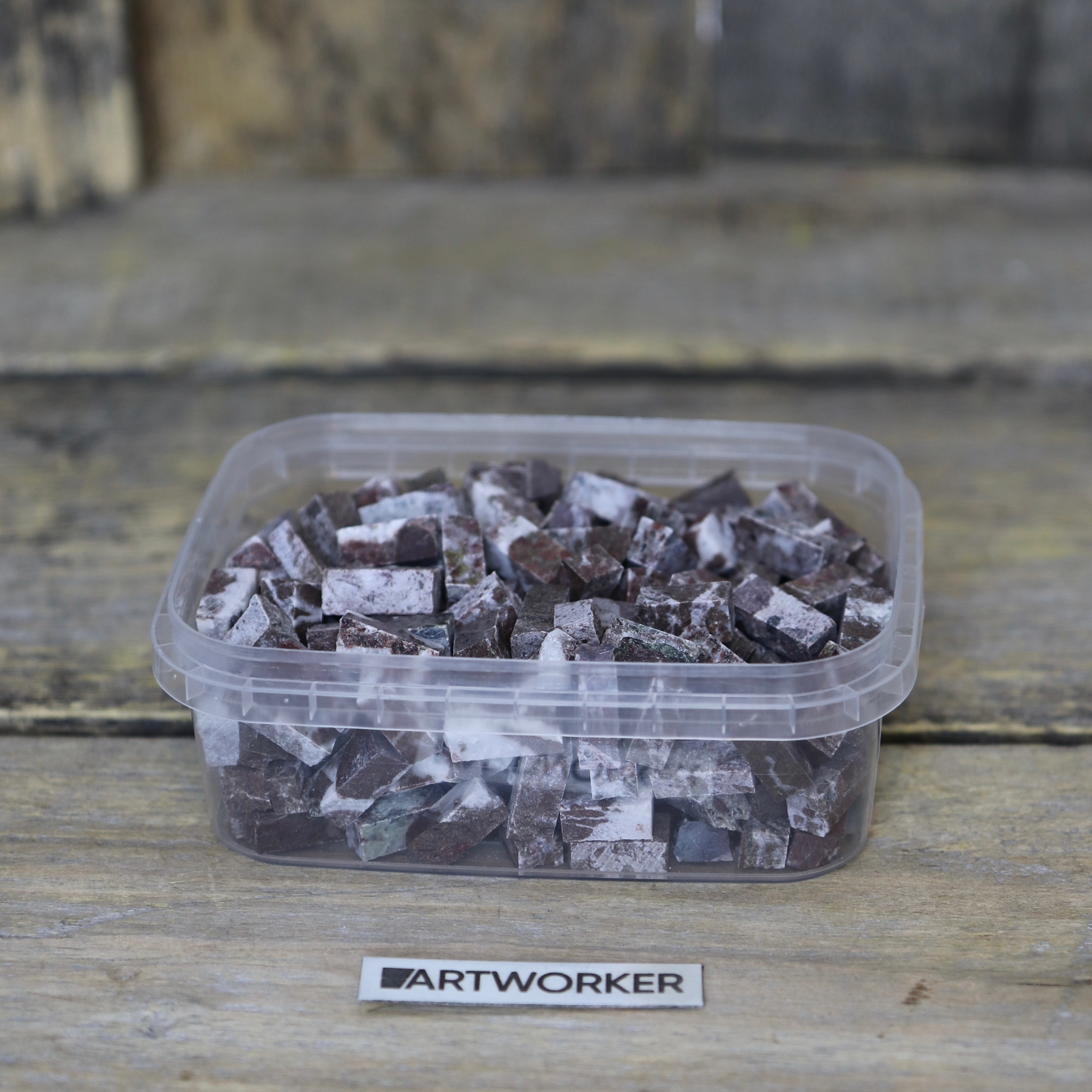Поставляется в прозрачном контейнере, вес материала и контейнера 350 гр (+/- 20 гр). Для колки натурального камня потребуются кусачки-щипцы (кусачки для мозаики), к примеру RedCut 83 или RedCut 82. Колотый камень можно приклеивать на цементный клей (например Kerabond + Isolastic) или любой другой подходящий клей.