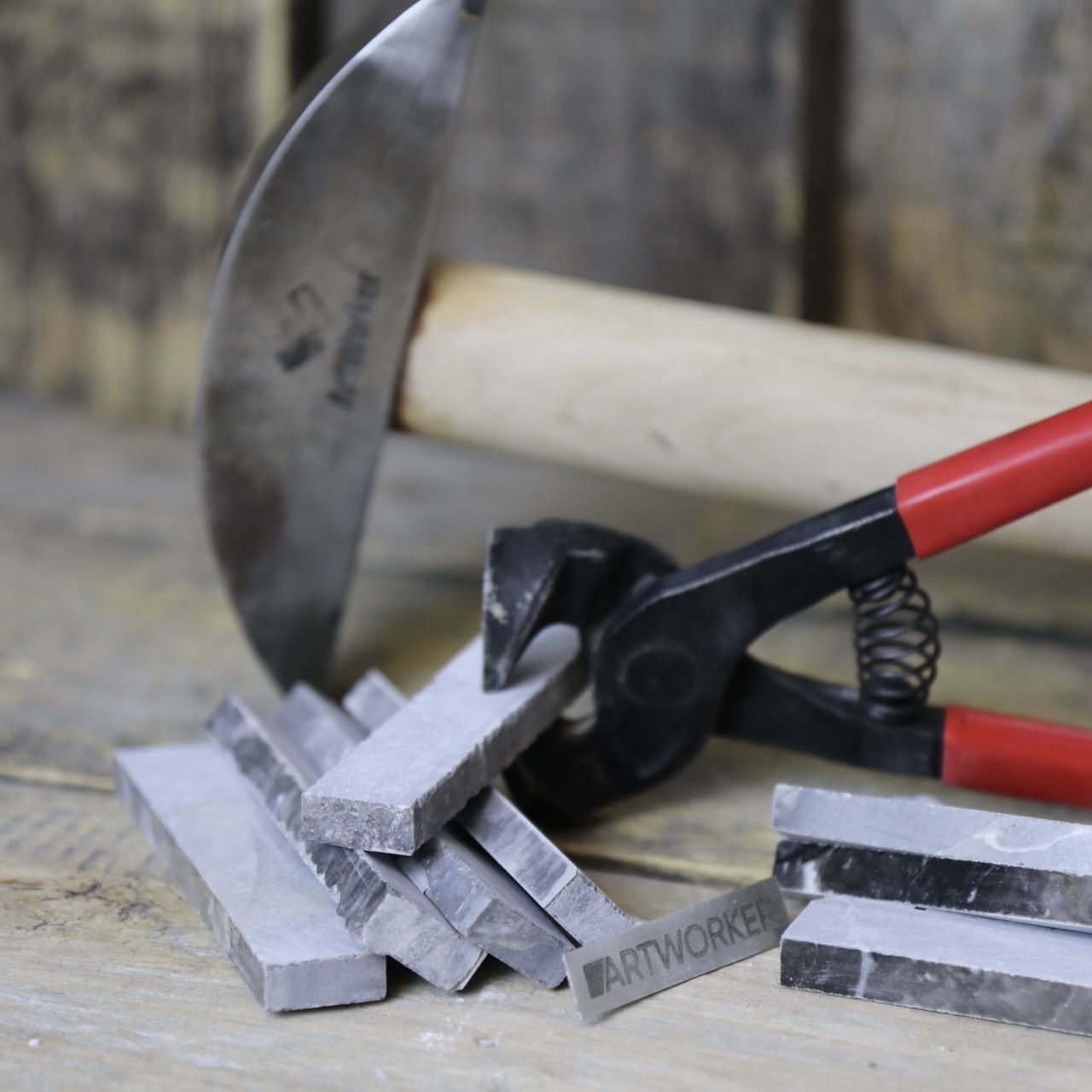 Обращаем ваше внимание, что одних кусачек будет недостаточно для работы с пиленным камнем, кусачки пригодятся для работы с уже наколотым материалом. Для работы с камнем в брусках потребуются молоток для колки смальты и харди (наковальня).