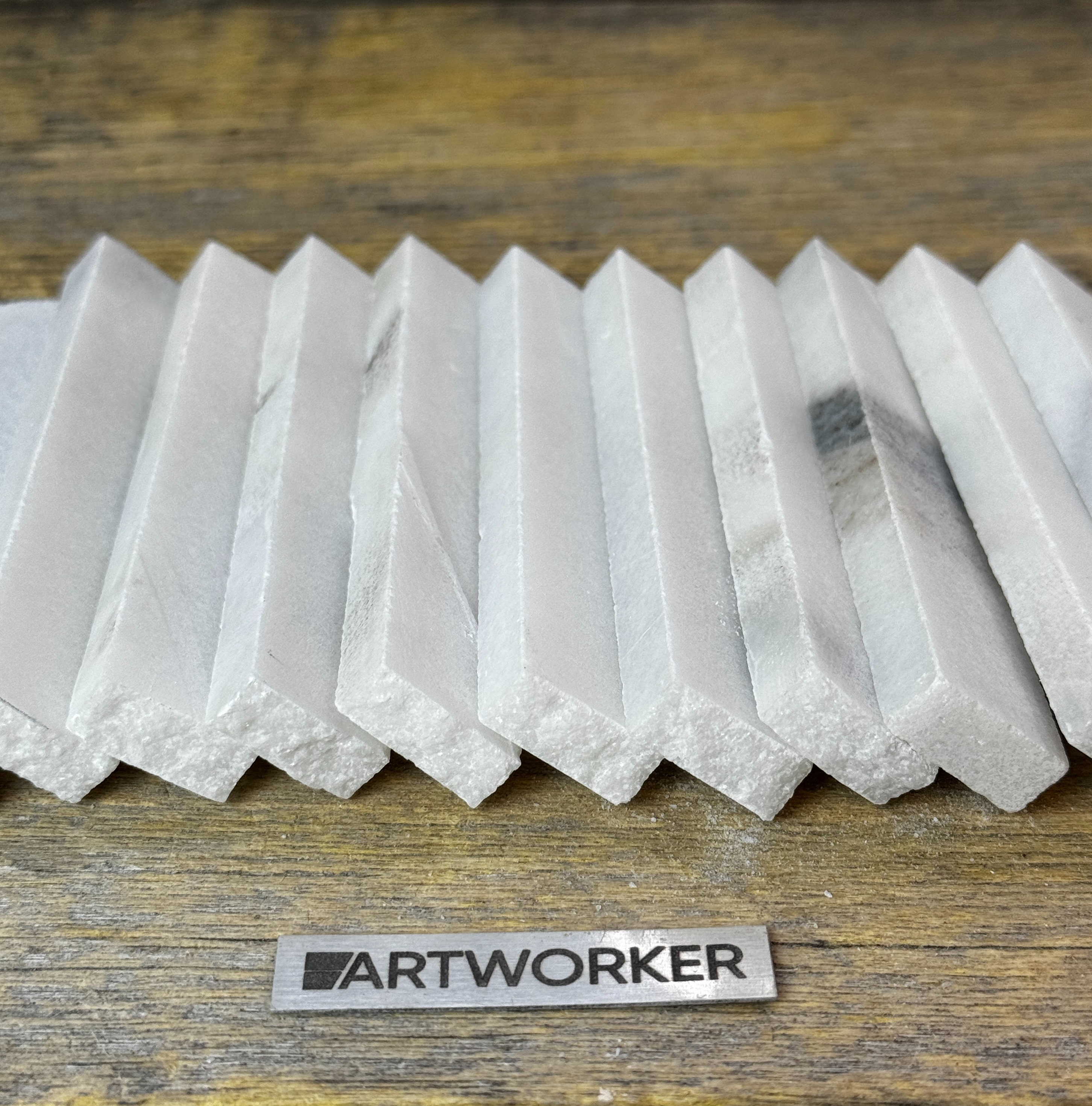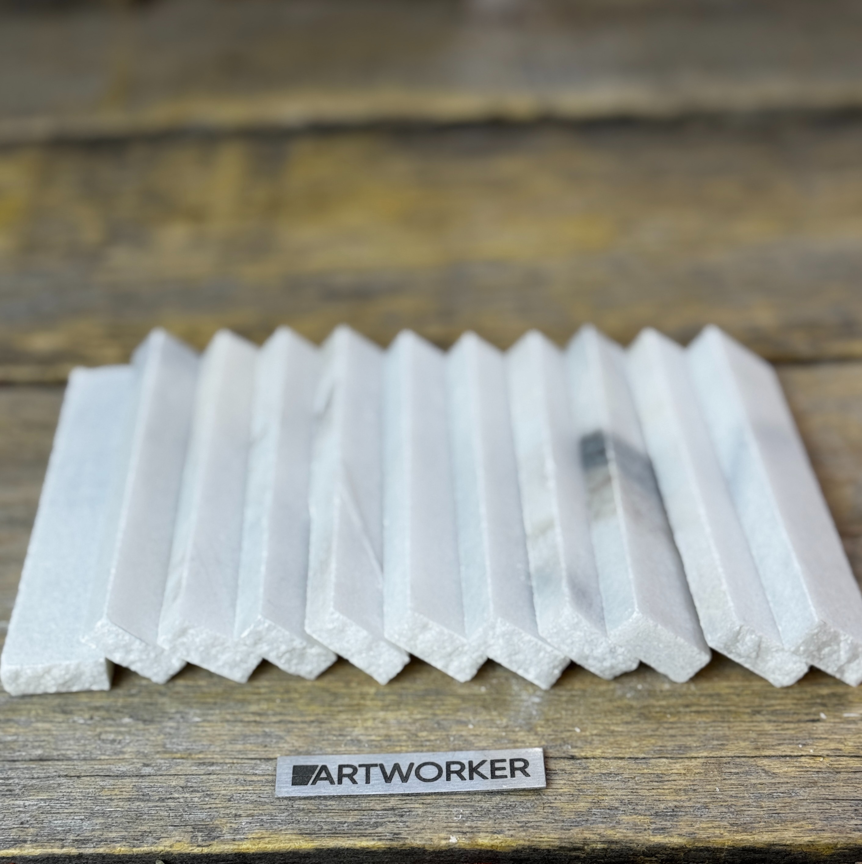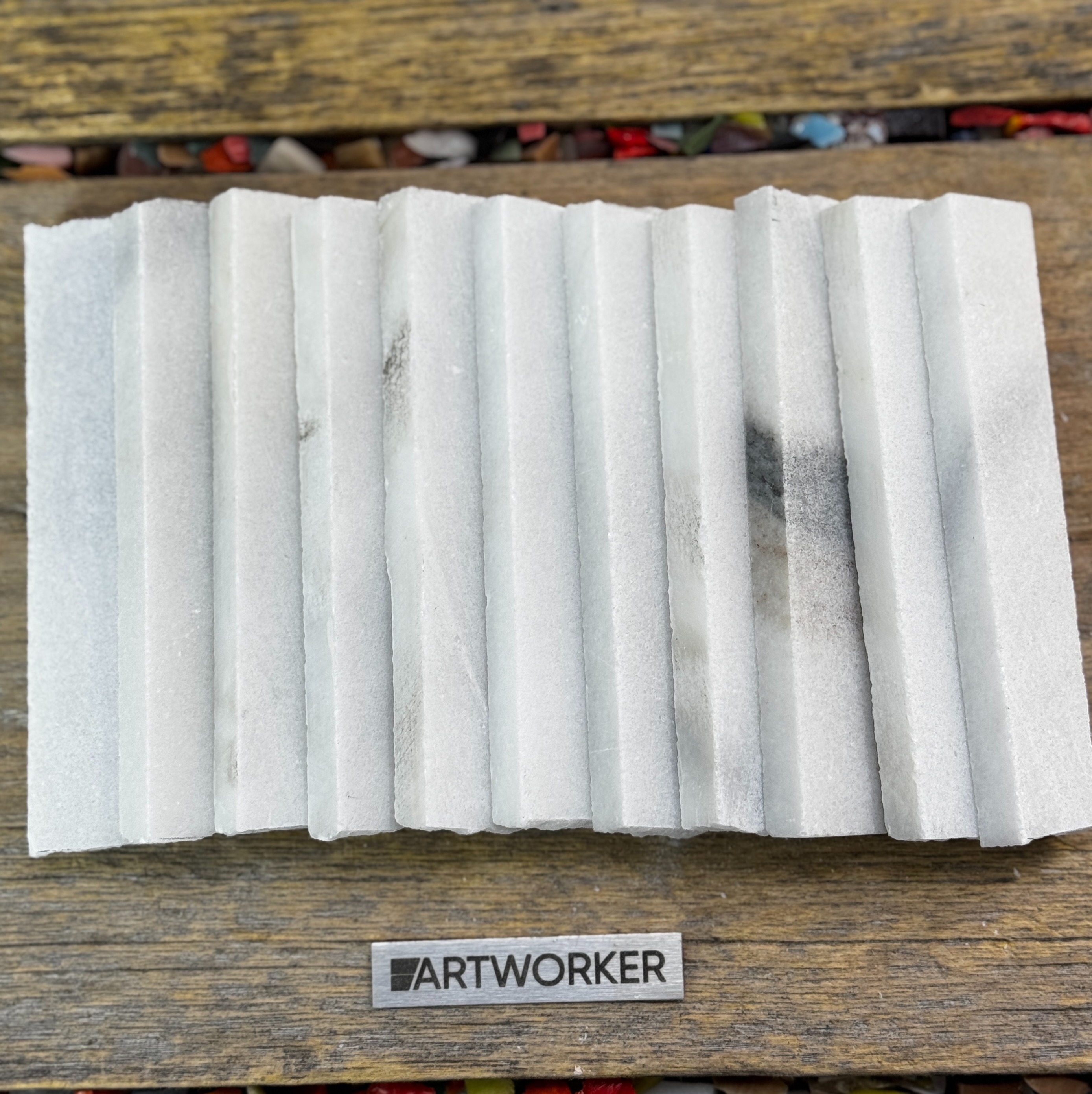 Натуральный камень белых оттенков с темными кусочками пиленный на бруски.