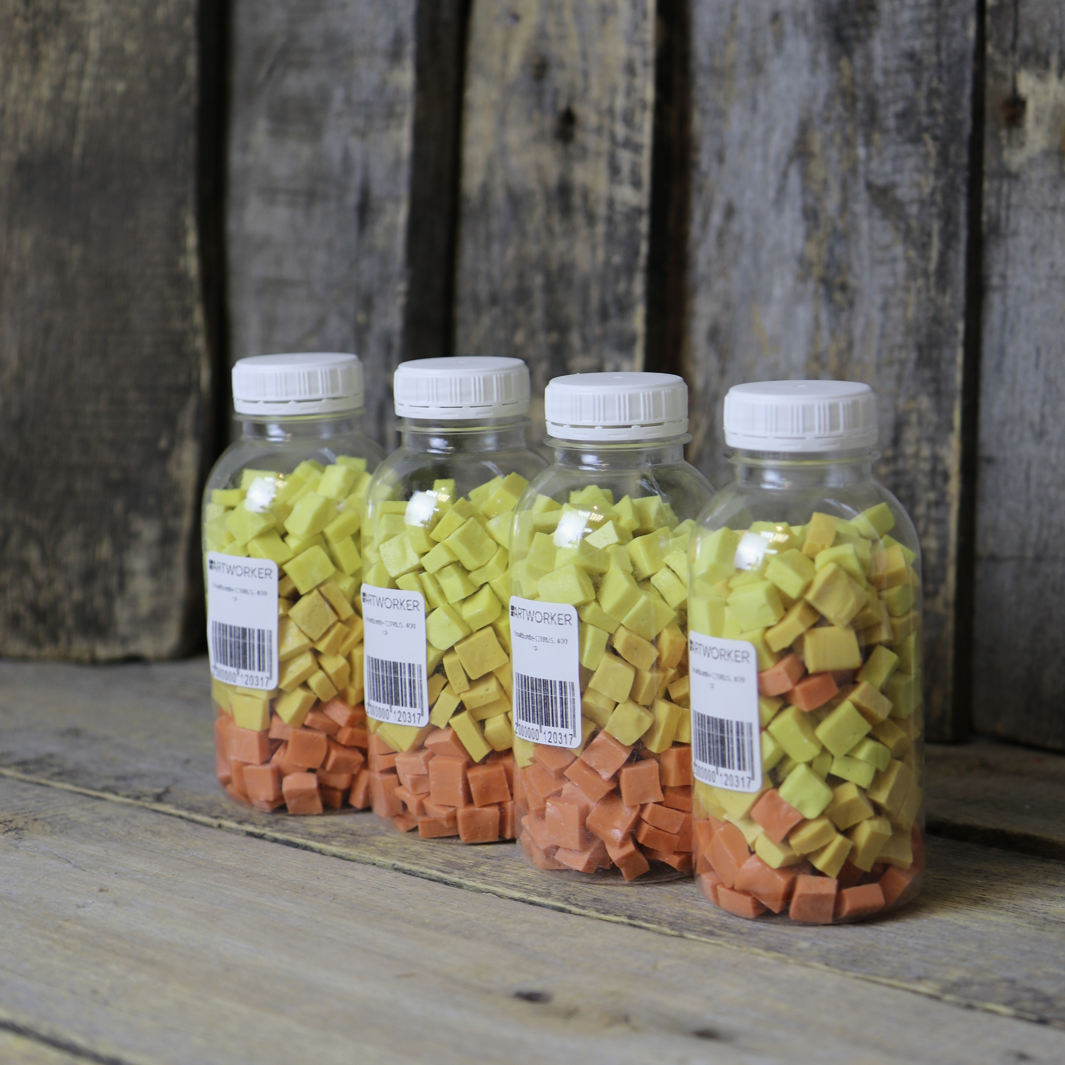 Бутылка с желтой и оранжевой смальтой — яркое украшение для вашего творчества и декора. Смальта в этой бутылке представляет собой мелкие стеклянные или керамические кусочки насыщенного оранжевого цвета, которые могут немного варьироваться по оттенкам, создавая живую и необычную палитру. Вес изделия составляет примерно 400 грамм, что делает её удобной для использования и хранения.