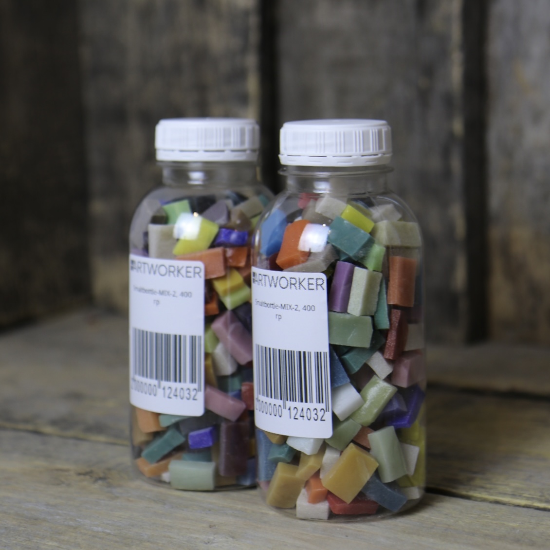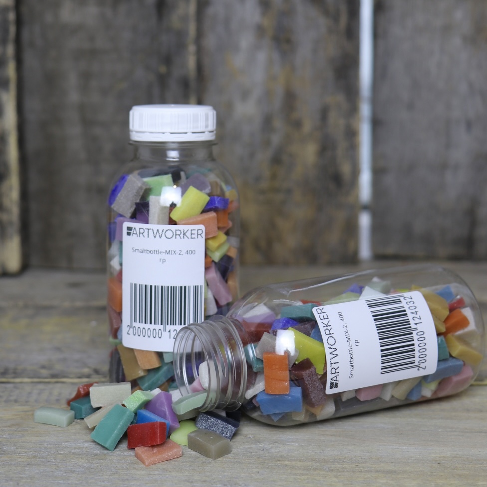 Бутылка с цветной смальтой — яркое украшение для вашего творчества и декора. Смальта в этой бутылке представляет собой мелкие стеклянные или керамические кусочки из микса разных цветов, которые могут немного варьироваться по оттенкам, создавая живую и необычную палитру. Вес изделия составляет примерно 400 грамм, что делает её удобной для использования и хранения.