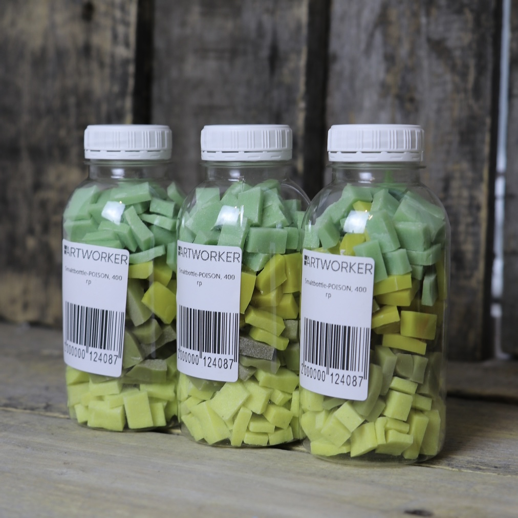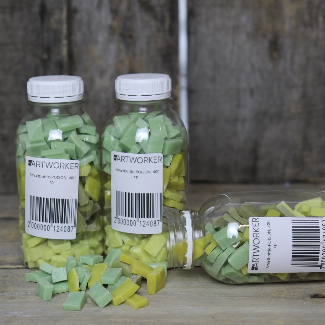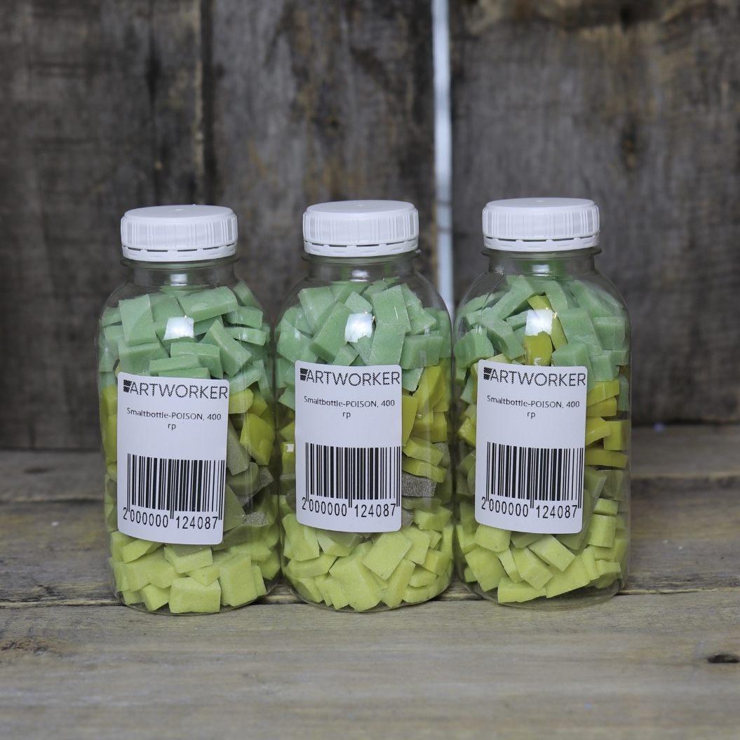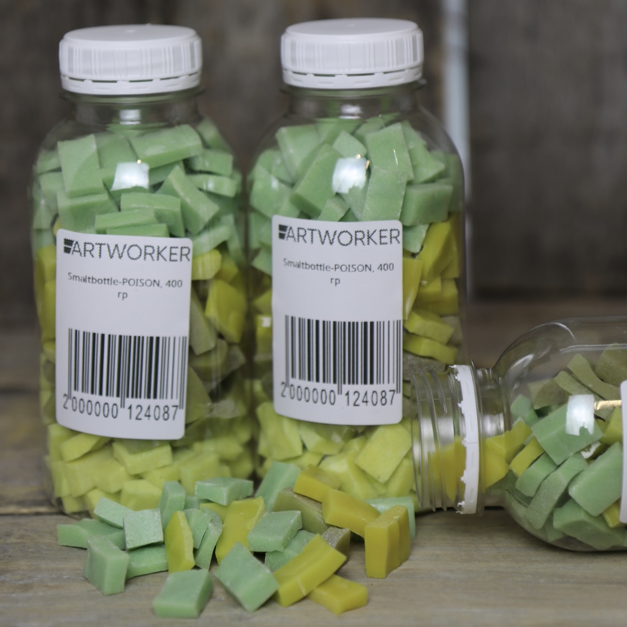 Бутылка с желтой и зеленой смальтой — яркое украшение для вашего творчества и декора. Смальта в этой бутылке представляет собой мелкие стеклянные или керамические кусочки насыщенного желтого цвета, которые могут немного варьироваться по оттенкам, создавая живую и необычную палитру. Вес изделия составляет примерно 400 грамм, что делает её удобной для использования и хранения.