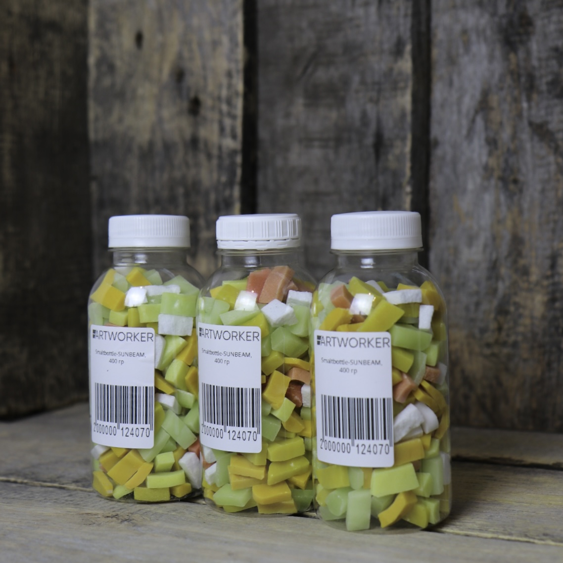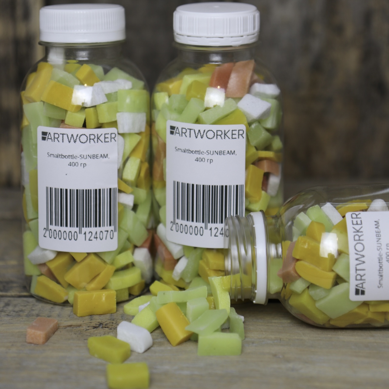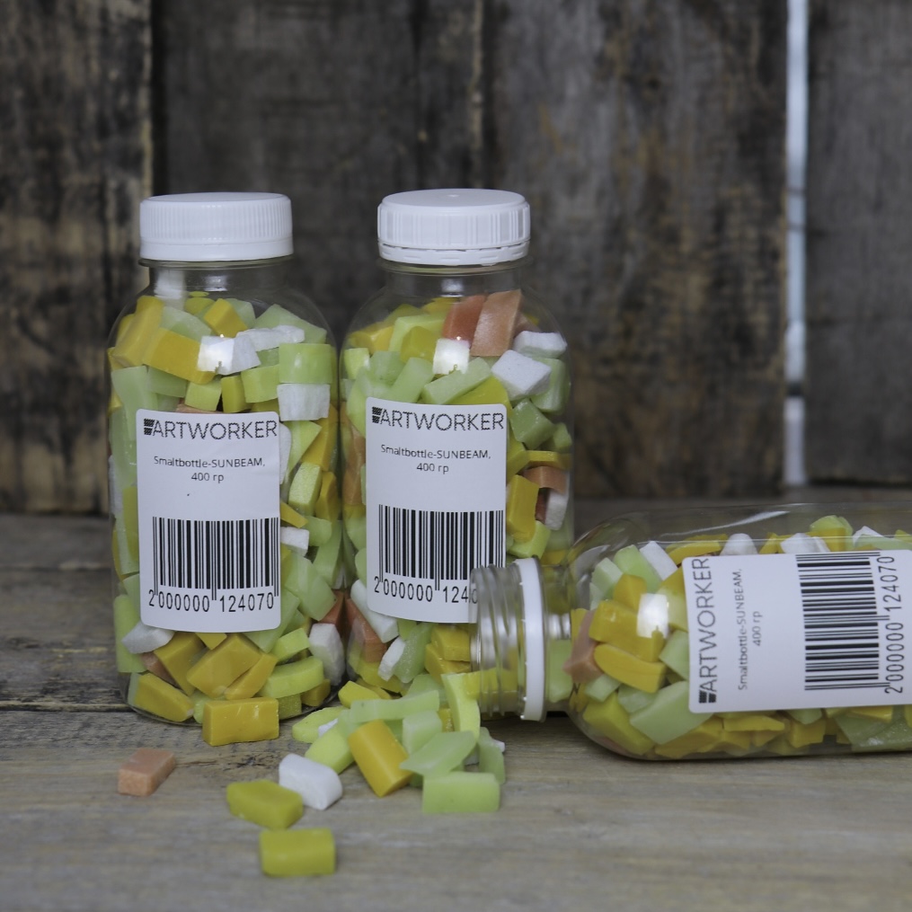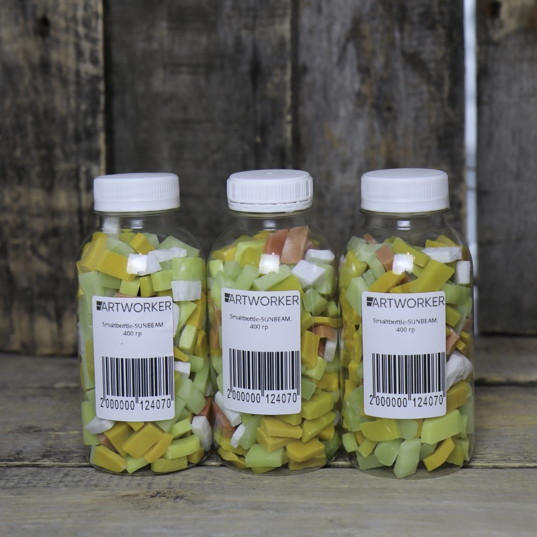 Бутылка с желтой и оранжевой смальтой — яркое украшение для вашего творчества и декора. Смальта в этой бутылке представляет собой мелкие стеклянные или керамические кусочки насыщенного оранжевого цвета, которые могут немного варьироваться по оттенкам, создавая живую и необычную палитру. Вес изделия составляет примерно 400 грамм, что делает её удобной для использования и хранения.
