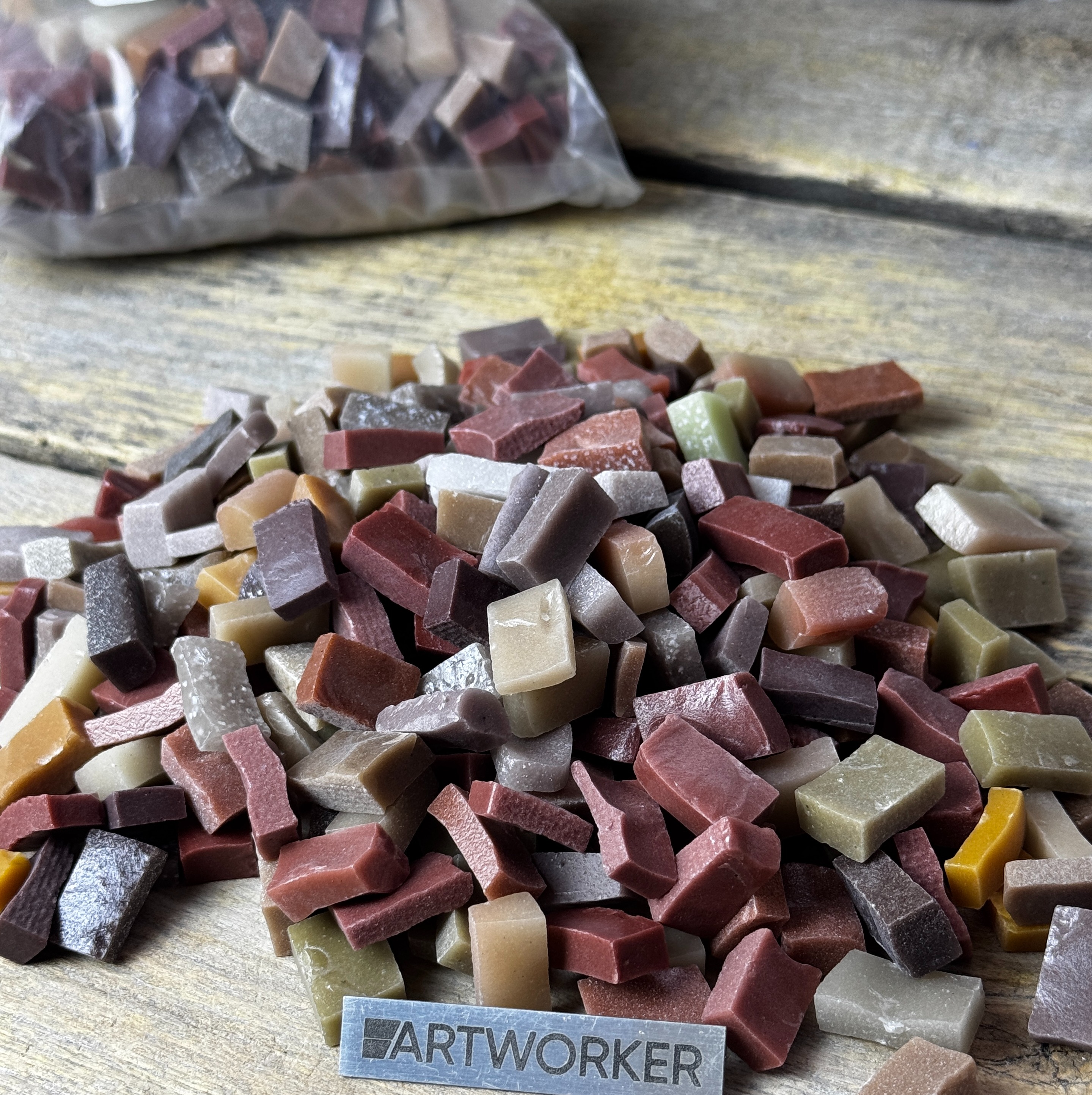 Вес материала 600 гр. Около 250 шт кусочков смальты, которых хватит на площадь около 20х20 см. Для работы со смальтой серии SMALT SET вам дополнительно потребуются дисковые кусачки для мозаики, пинцет, мастихин, клей и пластификатор.