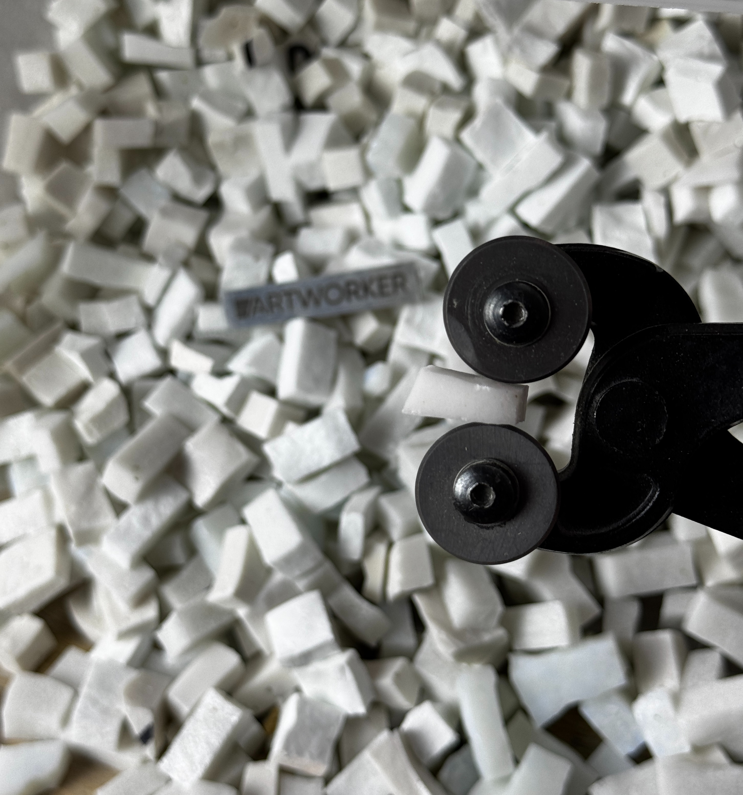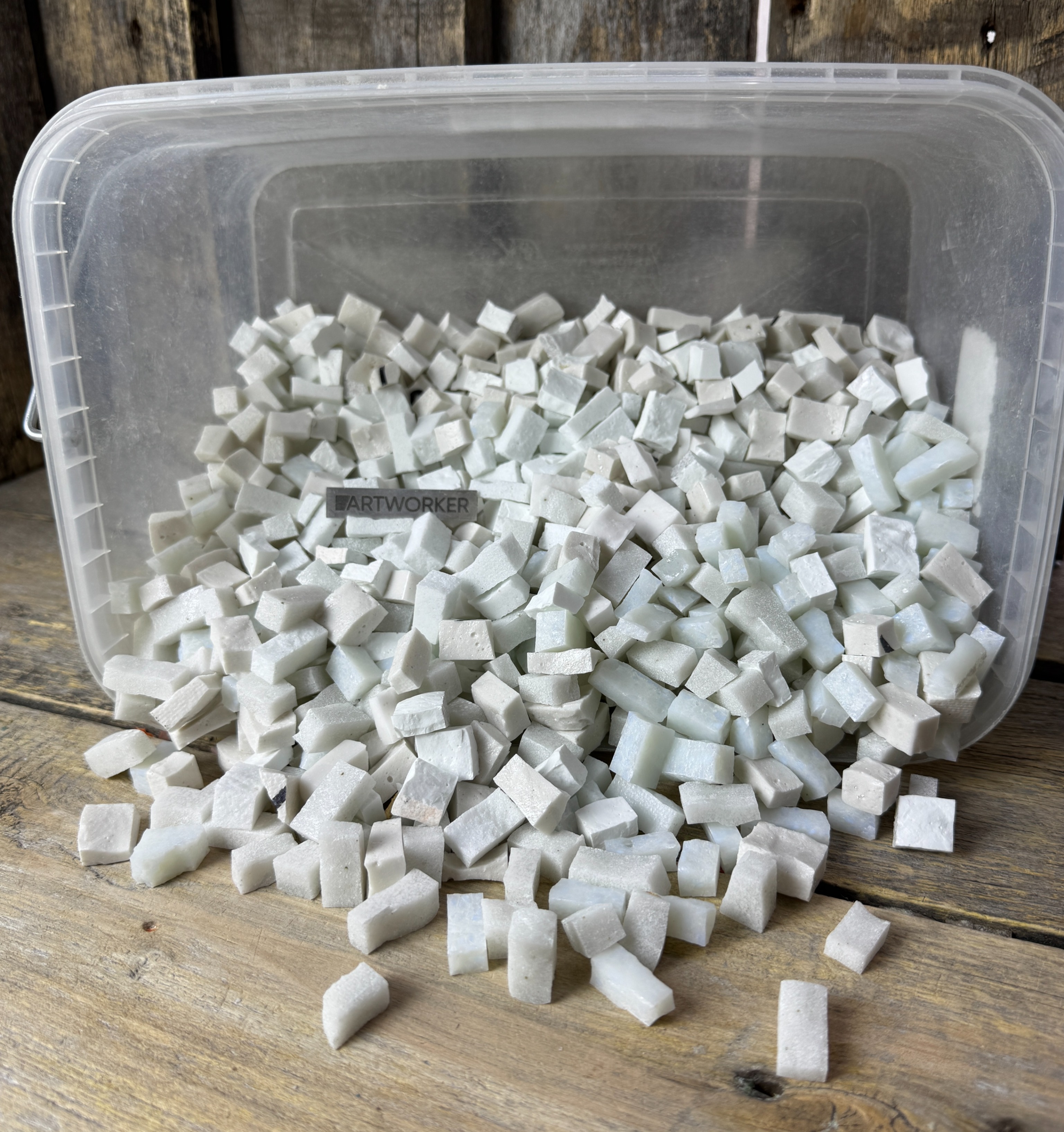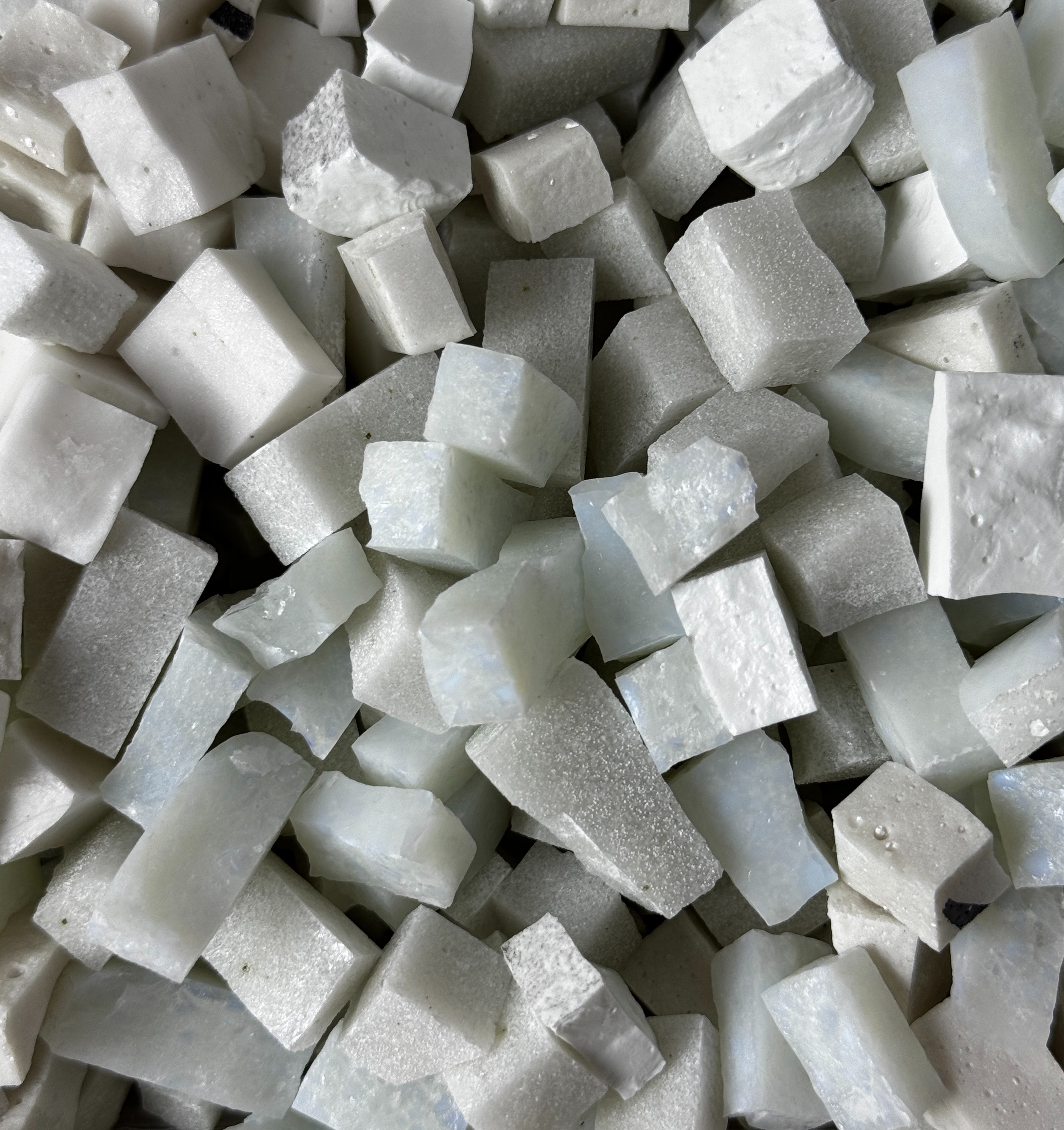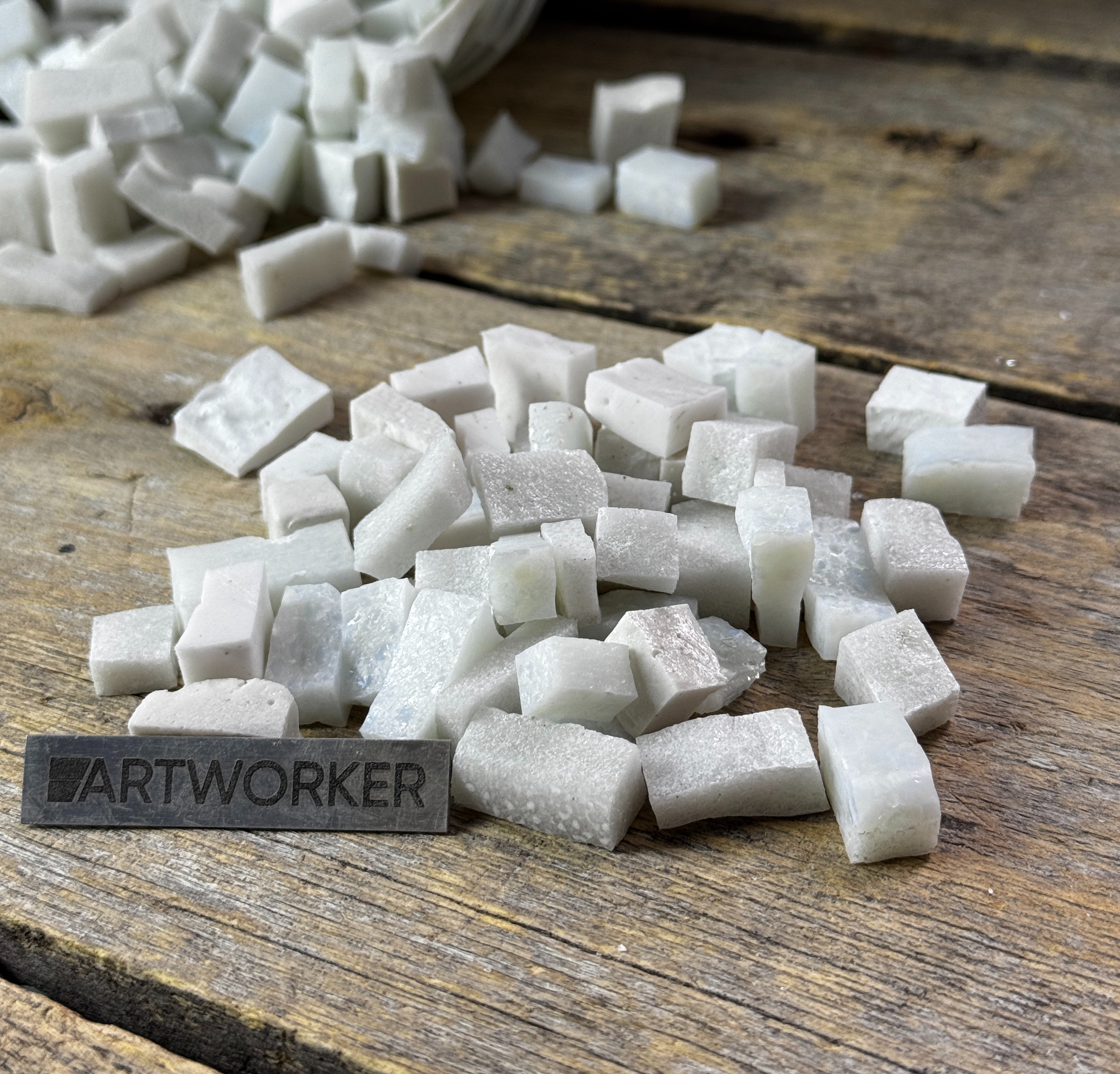 Разноформатная колотая смальта белых и бежевых оттенков для мозаики, цена за 1кг. Стеклянная мозаика разных оттенков белого цвета размером 20х17х6 мм (+/- 2 мм). Подходит для творческих работ и обучения.